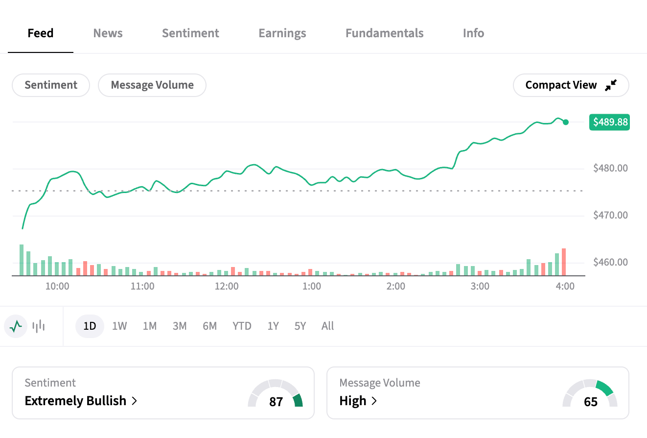 Market Action: Tesla stock closed 3% higher after hitting an all-time high of $489.88, leading retail sentiment on Stocktwits to jump to "extremely bullish."