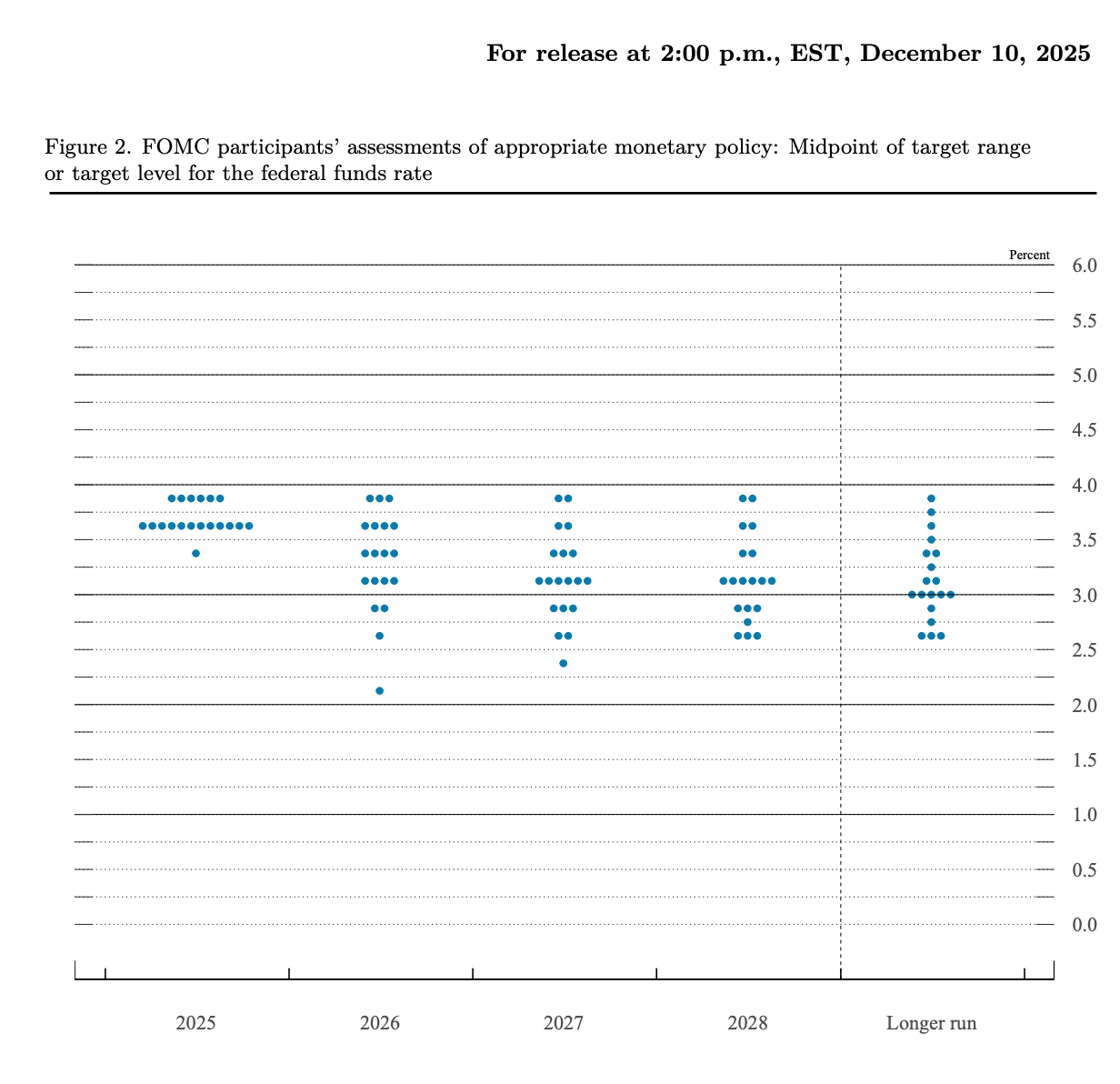 The future-looking Dot Plot further showed that three or more voting members even saw rates going UP next year! Looking ahead, one member (likely Miran) foresees as many as five rate cuts in 2026, down to a 2.0% target rate. This widening range of views underscores the high-stakes debate over the future of monetary policy ain’t over yet.