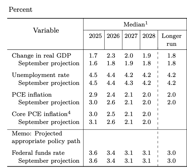 The Federal Reserve's Federal Open Market Committee delivered a widely expected 25 basis point rate cut, bringing the new target range for the Federal Funds Rate to 3.5% / 3.75%. Powell said that economic activity is expanding slowly, job gains have slowed, and the unemployment rate has edged higher, but inflation has mostly stayed put.