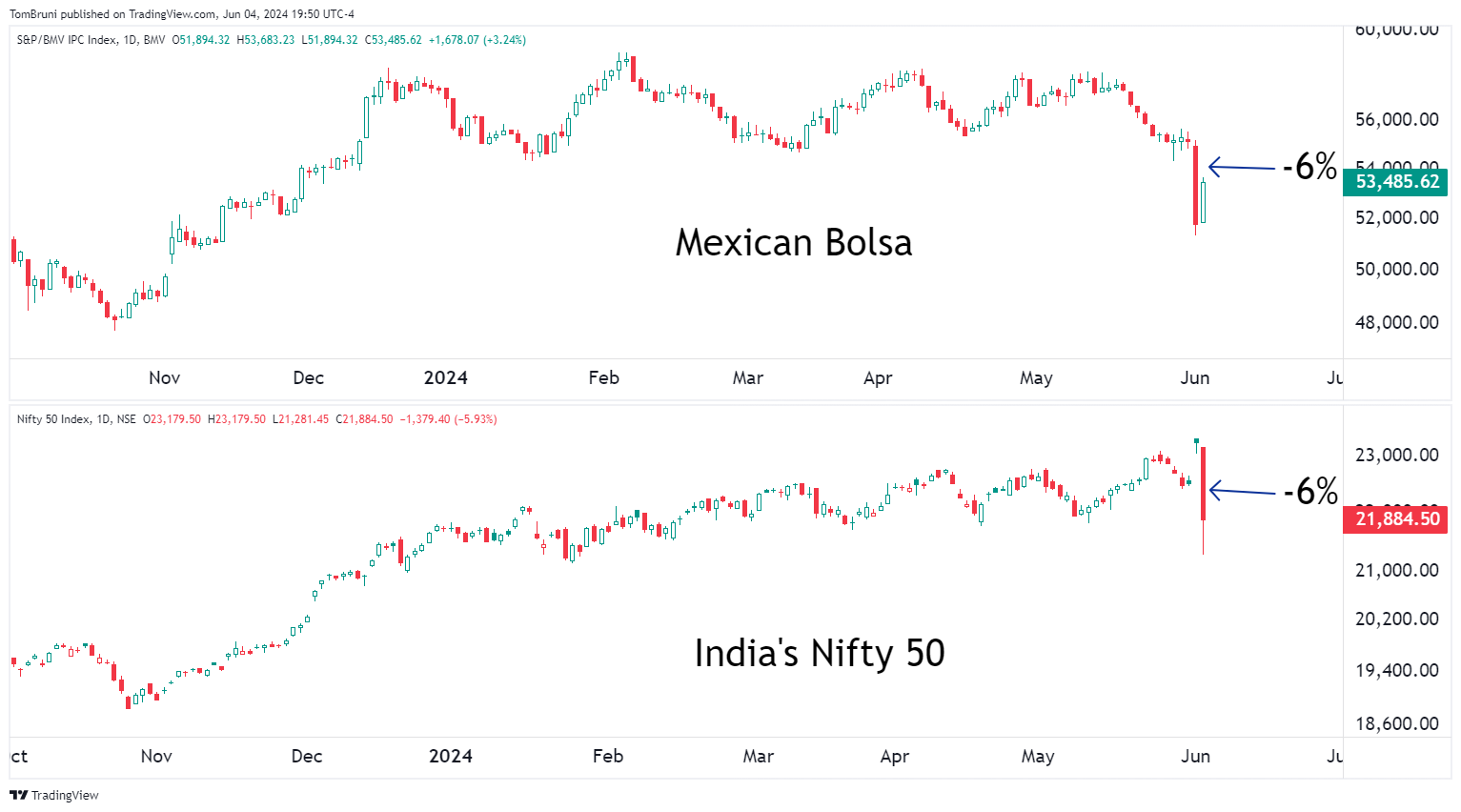 Both Mexico’s Bolsa index and India’s Nifty 50 index fell 6% following their election news this week, adding uncertainty to markets that were previously trading at all-time highs. 🙃