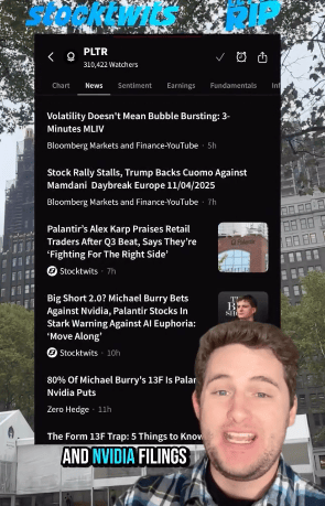 $PLTR ( ▼ 7.94% ) was down after Big Short hedge fund manager Michael Burry said he bought long puts on Palantir and Nvidia. Filings don't show shorter options if the strategy is a part of a spread. Burry was waxing about market bubbles just a couple days ago, posting a screenshot of Christian Bale playing him in the movie ‘The Big Short.” Cringe.