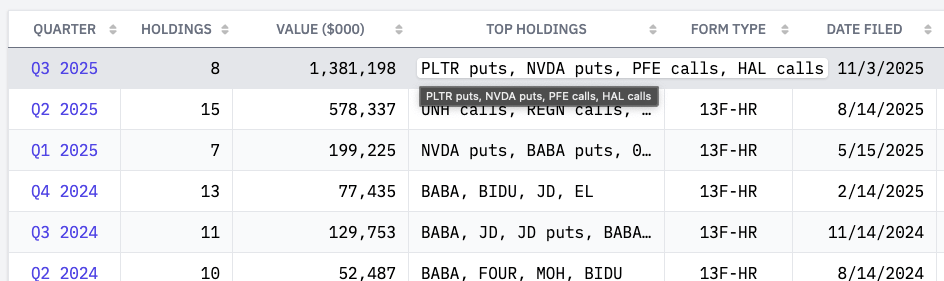 Anyway, the long-dated Puts show the ‘nominal value’ of the shares the options contracts control, not what Burry and gang paid. The $912M for PLTR and $186M for Nvidia puts dated September 30th likely cost a whole lot less, and are a part of an unknown strategy — 13f filings don’t require short-term options.