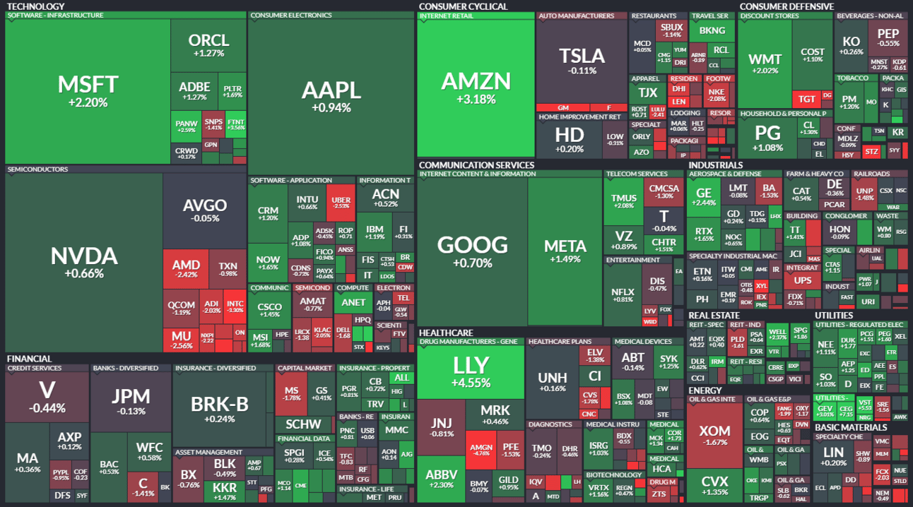 Here’s the S&P 500 heatmap. 9 of 11 sectors closed green, with utilities (+1.59%) leading and materials (-0.75%) lagging.