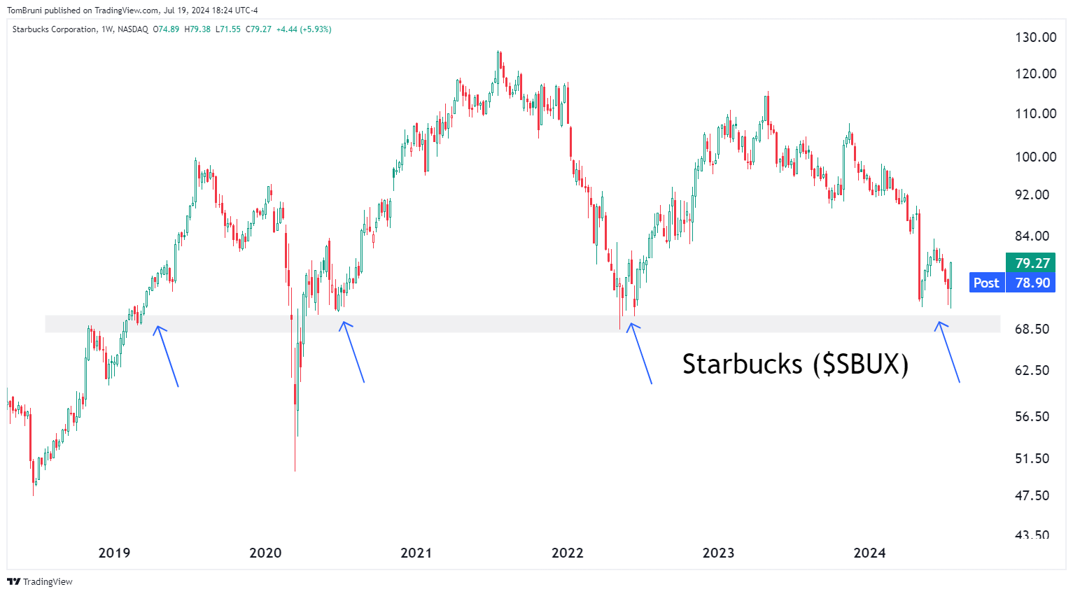We’ll have to wait and see how things play out from here. But with money rotating from high-flying tech into beaten-down “blue chips,” many view Starbucks as the next big catch-up candidate. 💡