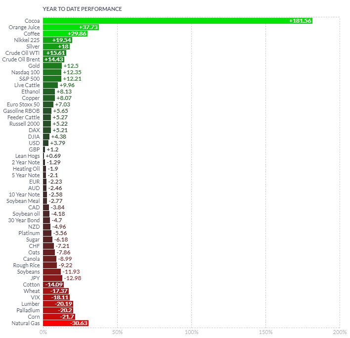 The first year-to-date chart shows international stocks and large-cap U.S. indexes leading the charge to the upside. Meanwhile, the small-cap Russell 2000 is finally positive, up about 5% YTD after this week’s rally.