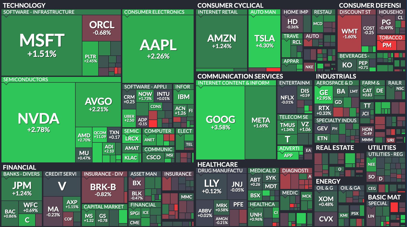 10 of 11 sectors closed green. Tech $XLK ( ▲ 1.85% ) lead and materials $XLB ( ▼ 0.05% ) lagged.