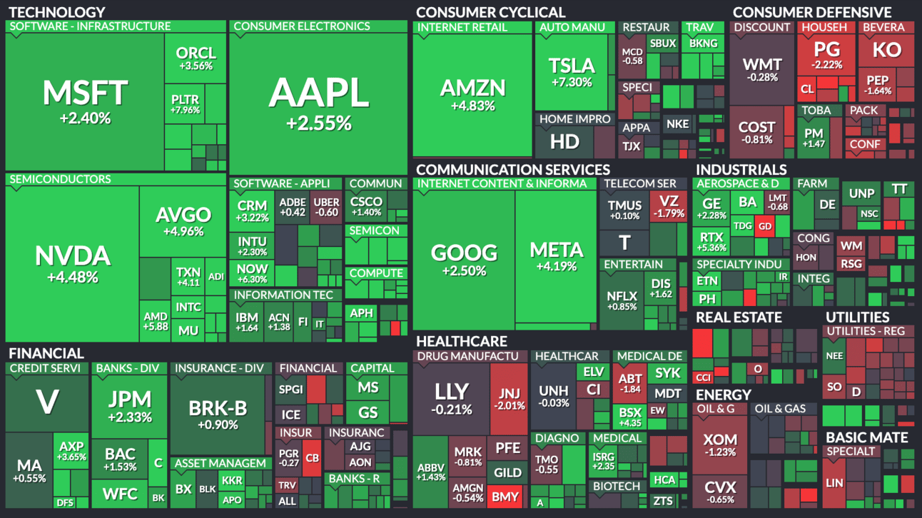 Here’s the S&P 500 heatmap. 9 of 11 sectors closed green, with technology (+5.56%) leading and consumer staples (-0.44%) lagging.