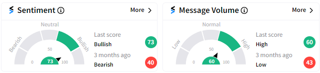 As for retail investors and traders, the Stocktwits community sentiment meter suggests they’re ‘bullish’ as well, looking for further upside. 💪