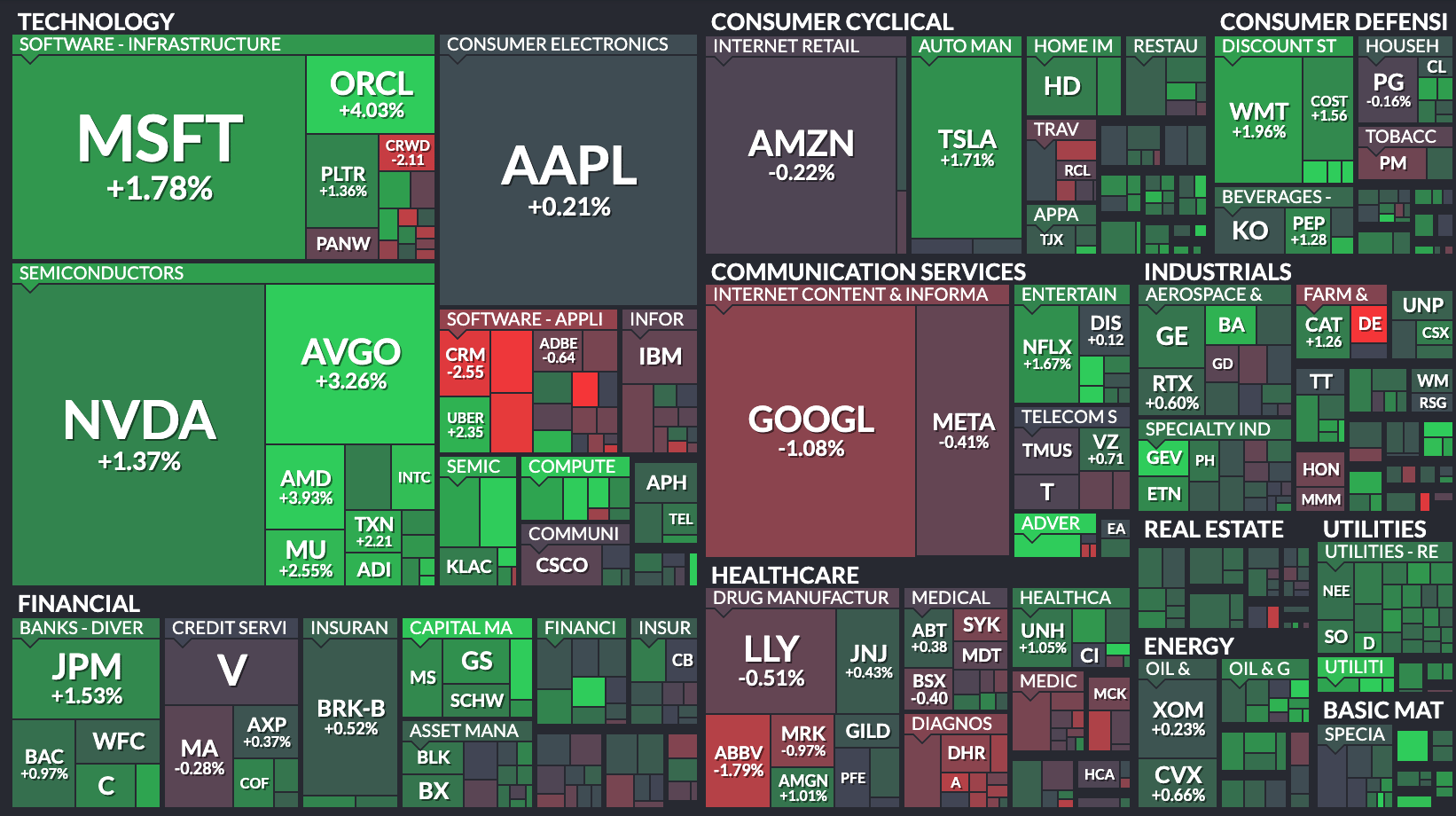 10 of 11 sectors closed green. Utilities $XLU ( ▲ 1.33% ) lead and healthcare $XLV ( ▼ 0.22% ) lagged.