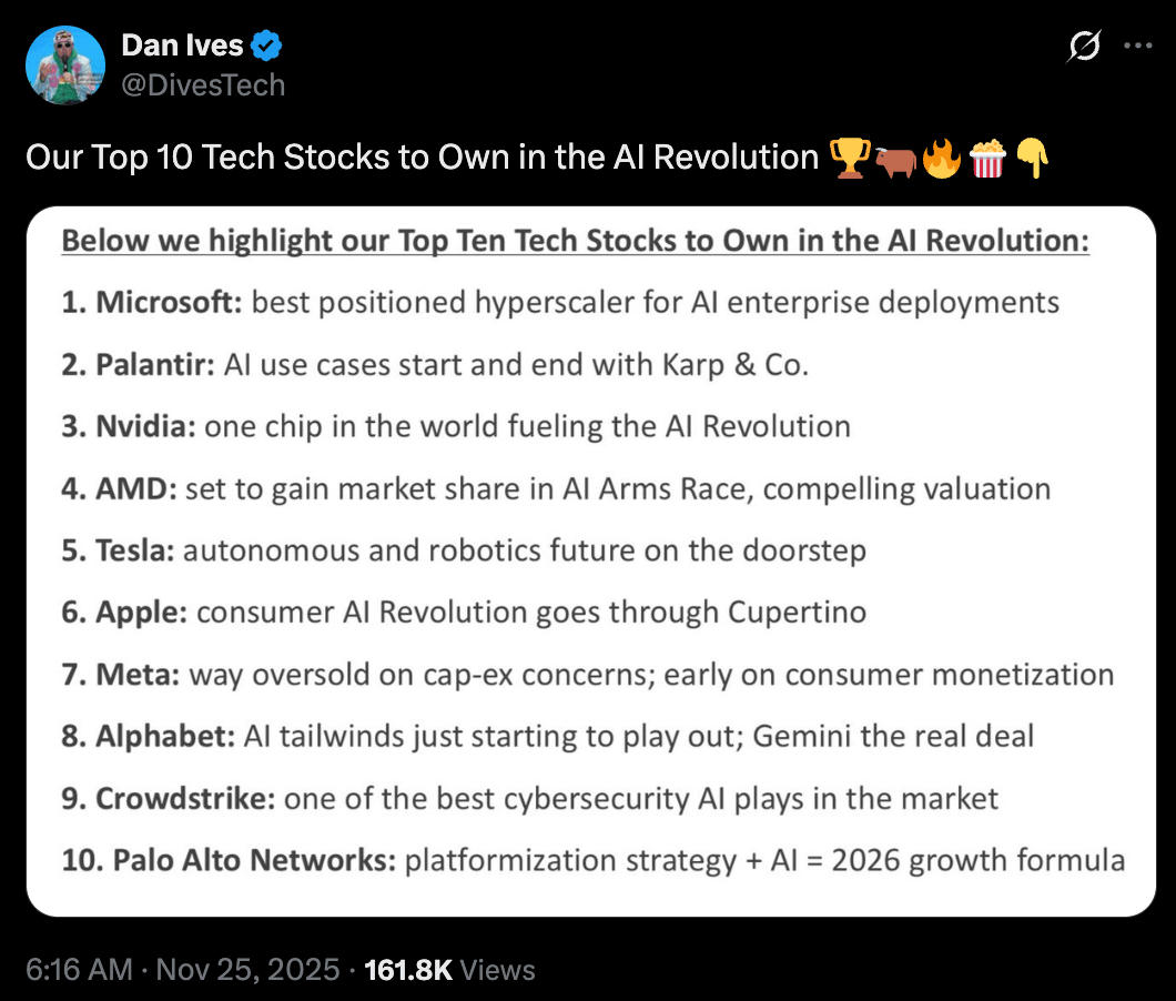 Pointing to this week’s Google TPU rumor about peer hyperscaler Meta, Ives said the real spending surge is now moving past buying Nvidia chips and into the actual software and security platforms needed to run AI.