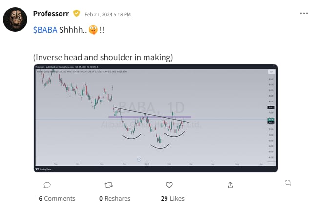Stocktwits user Professor shared his chart of Alibaba above, showing an "inverse head and shoulders" pattern potentially forming. This type of chart setup comes after a decline and can signal a trend reversal should prices break above the "neckline" created by either a downtrend line or horizontal level of support/resistance. 📏