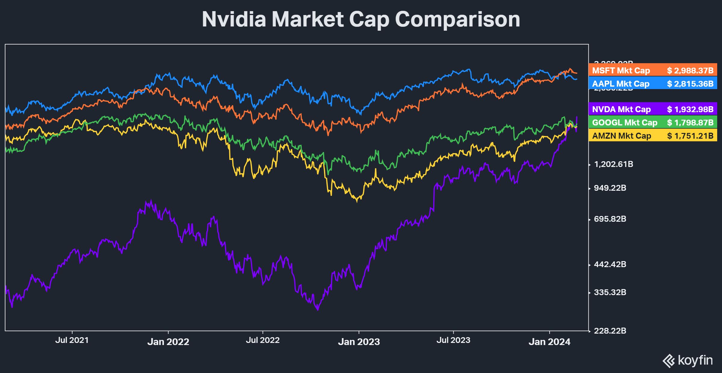 Firstly, a 16% rise in the stock today caused its market cap to rise $277 billion, the largest one-day increase of any stock in history. Secondly, today's move put it firmly ahead of Google and Amazon as the fourth-largest stock in the world (Saudi Aramco not pictured below). It also moved it a stone's throw away from $2 trillion. 🤩