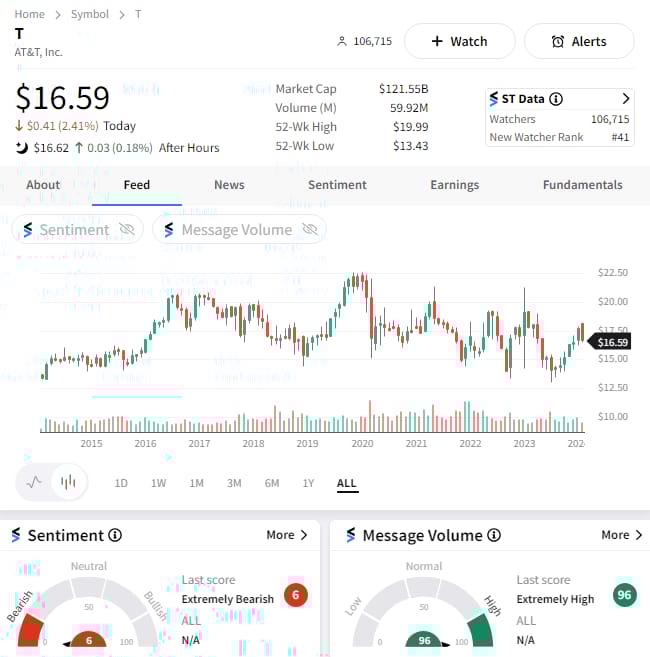 AT&T shares fell roughly 3% on the day, but the Stocktwits community is not looking to bottom-fish the troubled stock. Sentiment is currently in "extremely bearish" territory as investors look elsewhere for opportunity. 👎