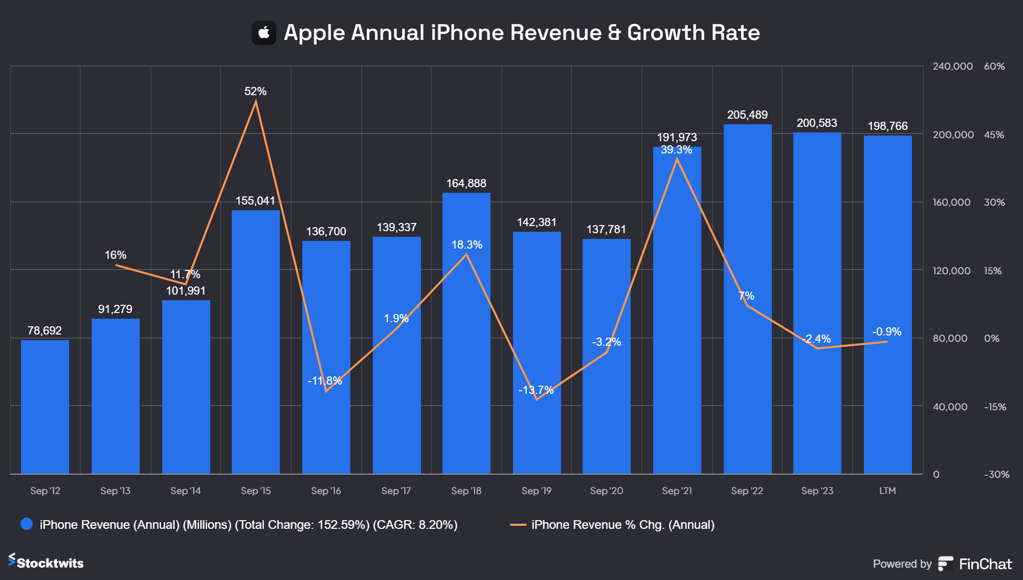Investors remain focused on the stagnant iPhone revenue growth, which hasn’t made meaningful upward progress since 2021. 📱