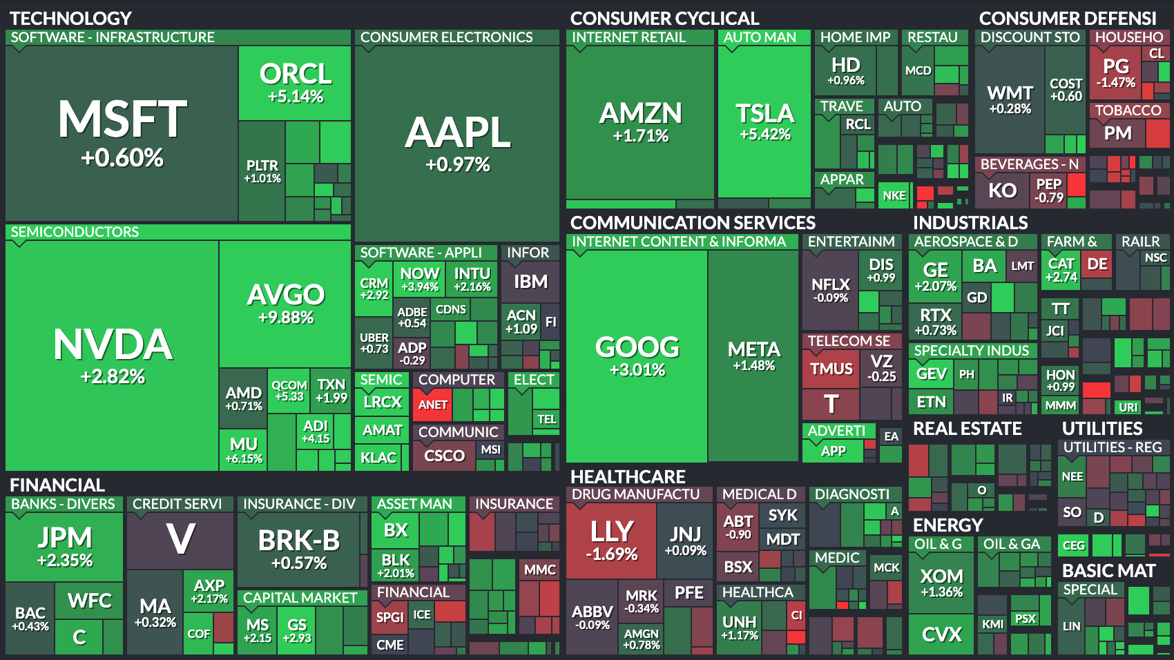 10 of 11 sectors closed green, with tech $XLK ( ▲ 2.44% ) leading and staples $XLP ( ▼ 0.33% ) lagging.