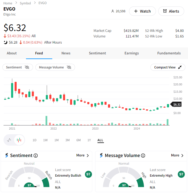 Most bullish/bearish symbols on Stocktwits at the close: 📈 $PW, $EVGO, $NRGV, $AMTD, $STEM 📉 $STZ, $BFLY, $PLBY, $BAC, $RKT*