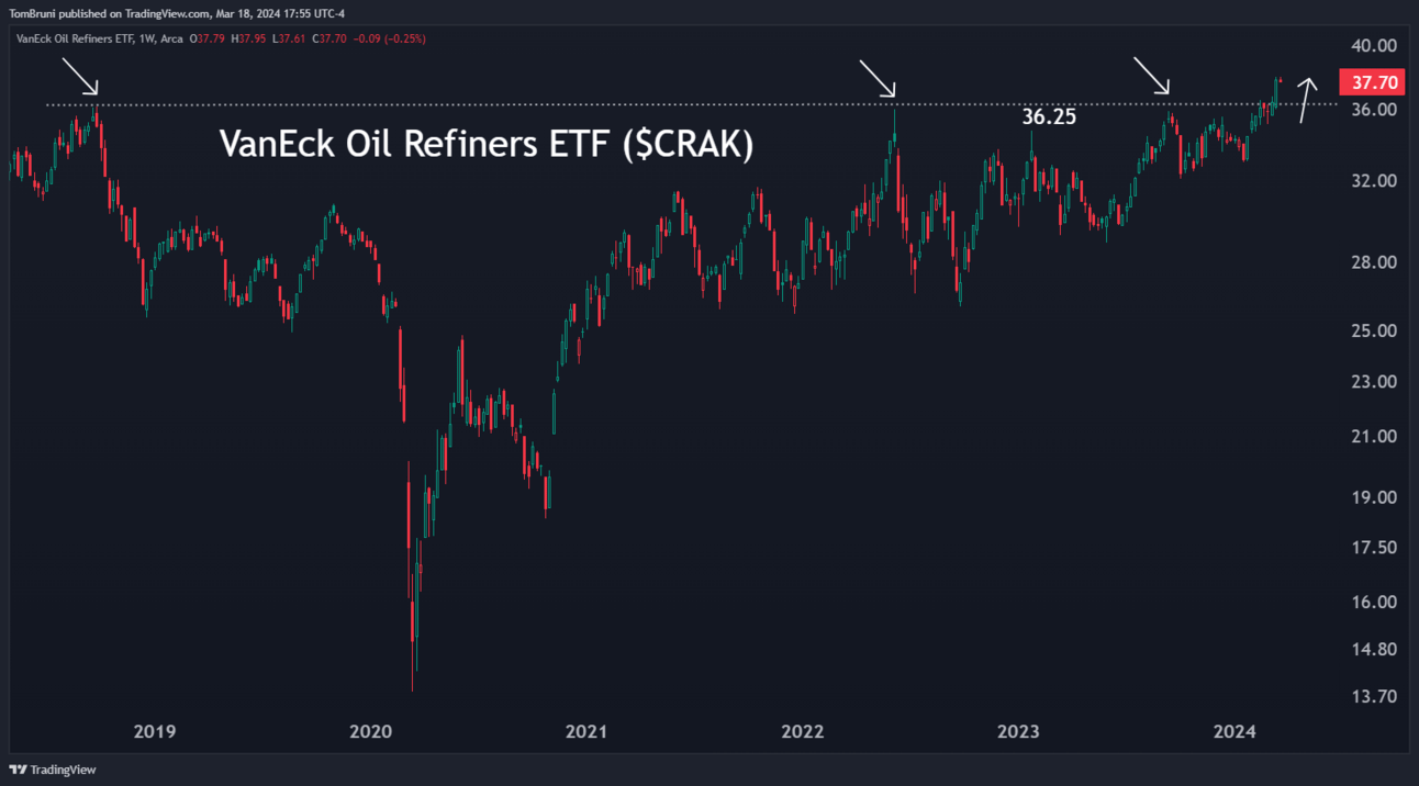 Below is a look at the VanEck Oil Refiners ETF ($CRAK) breaking out to fresh all-time highs after about five years of going nowhere. 📈