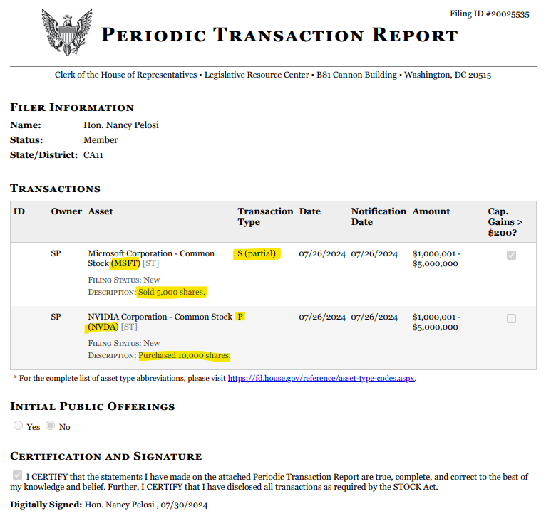 The trader extraordinare’s latest “periodic transaction report” indicated that she sold 5,000 shares of Microsoft and purchased 10,000 Nvidia shares last Friday, July 26th.