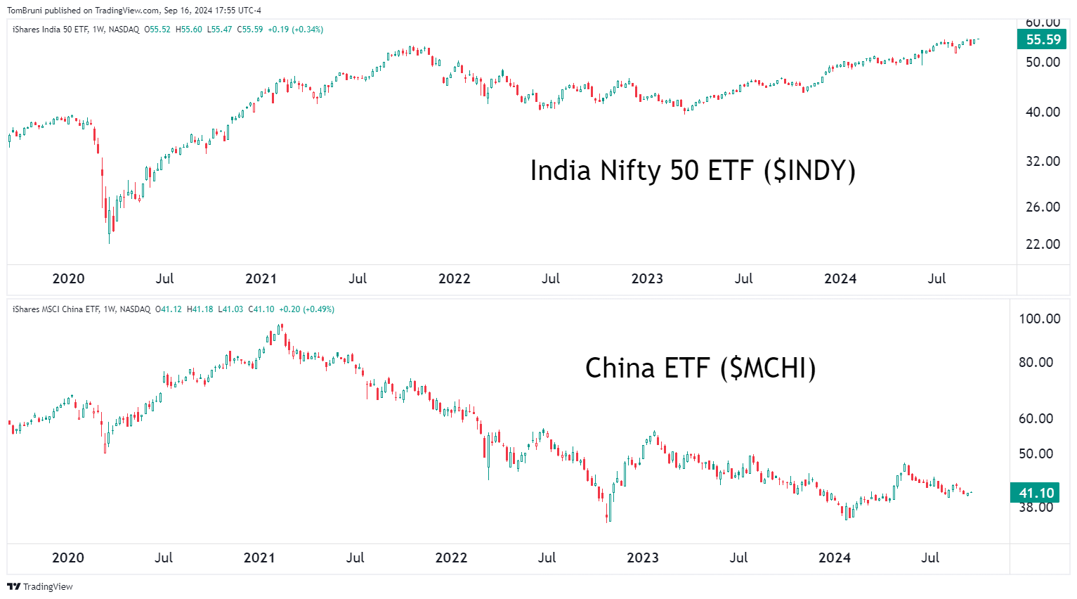 U.S. investors have noticed too, with flows continuing to favor India over China in the emerging market equity space. With the five-year charts looking like this, many investors are betting on continued outperformance. 📈