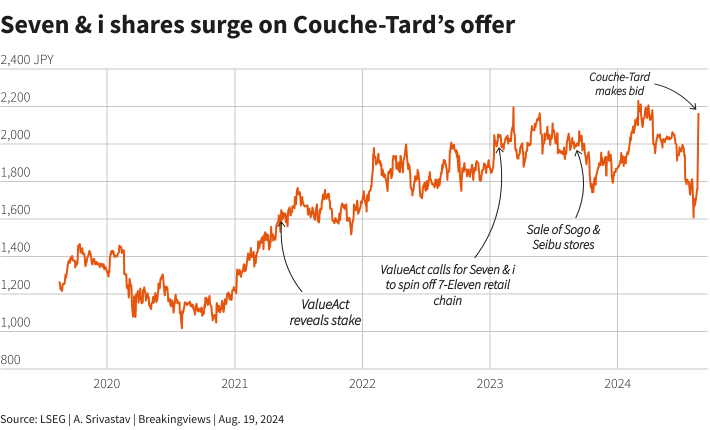 Financial details were not disclosed, but the proposal sent Seven & I shares surging to their daily upper limit of 23%, valuing the company at a record $38 billion.
