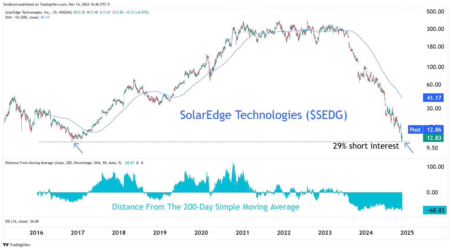 Solar stocks, in general, have been a rough bet, but many of them are now approaching levels at which bulls feel comfortable considering them again. The fundamental issues of high inventory levels weighing on pricing power and higher interest rates crippling demand are already well known. If the sector can show a slight improvement, that could be enough tinder to spark a move from depressed levels.