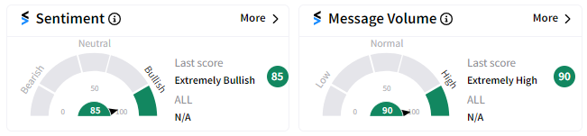 And the Stocktwits community appears to believe the stock has more gas left in the tank, with sentiment sitting in ‘extremely bullish territory.’ 🐂