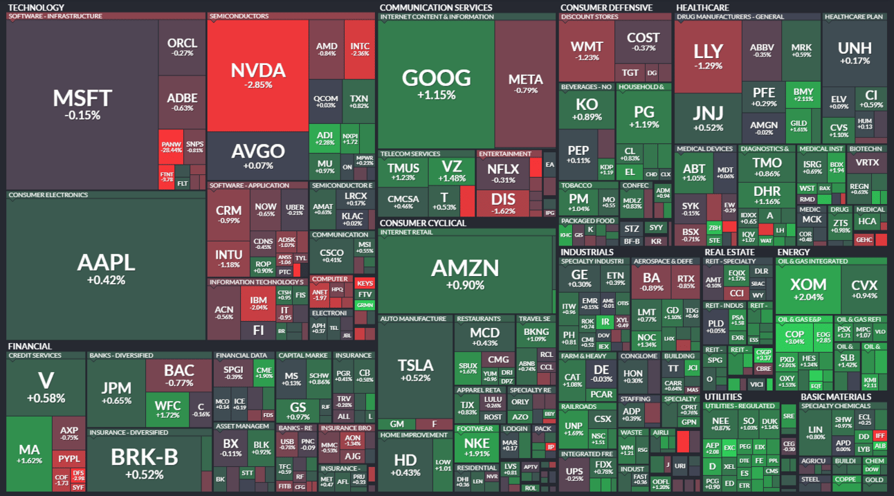 9 of 11 sectors closed green. Energy (+1.88%) led, & technology (-0.63%) lagged. π