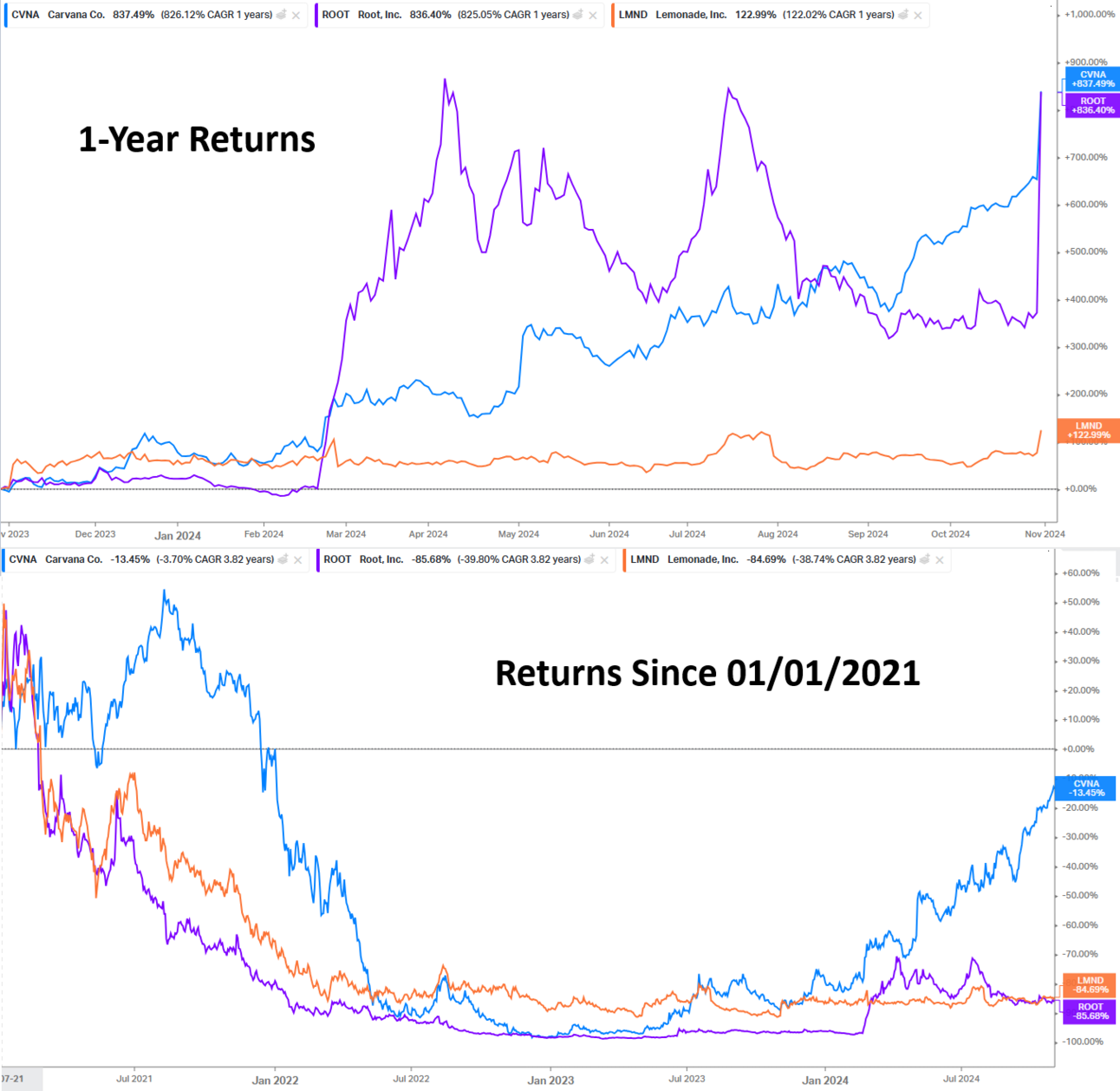 Below is a chart of the one-year returns showing Carvana, Root, and Lemonade all soaring triple-digits. But to contextualize these moves, we need the returns since January 2021, which are still deeply in the red (following ~99% drawdowns). 🙃