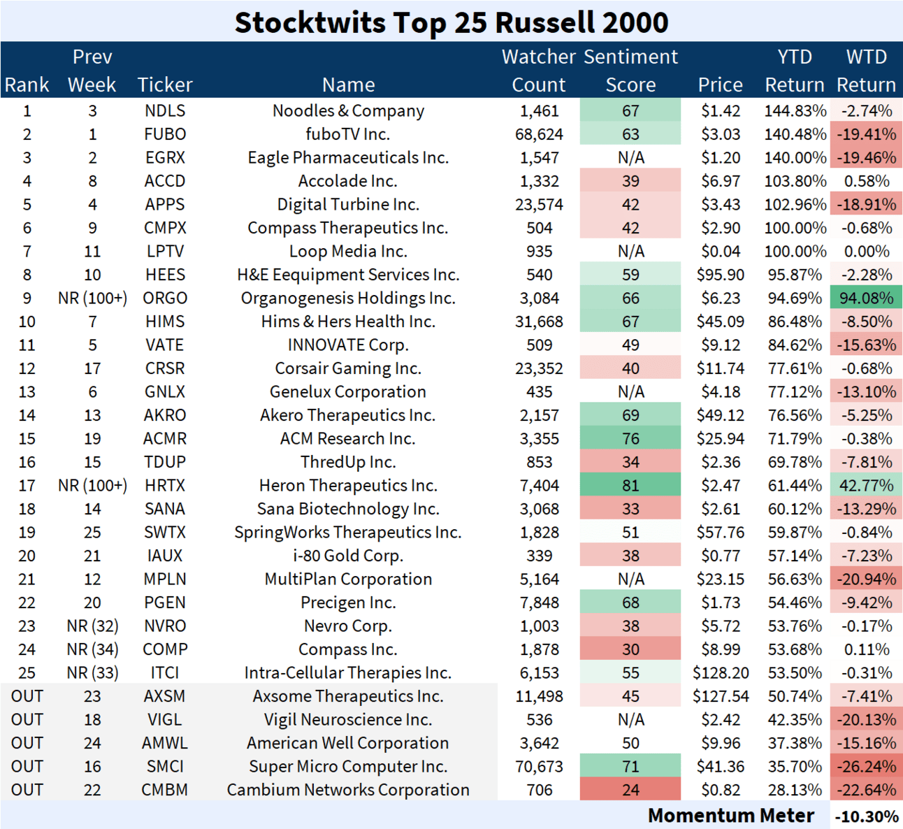 The Stocktwits Top 25 reports the 25 best-performing stocks in the S&P 500, Nasdaq 100, and Russell 2000 year to date (YTD) and tracks their performances over time.