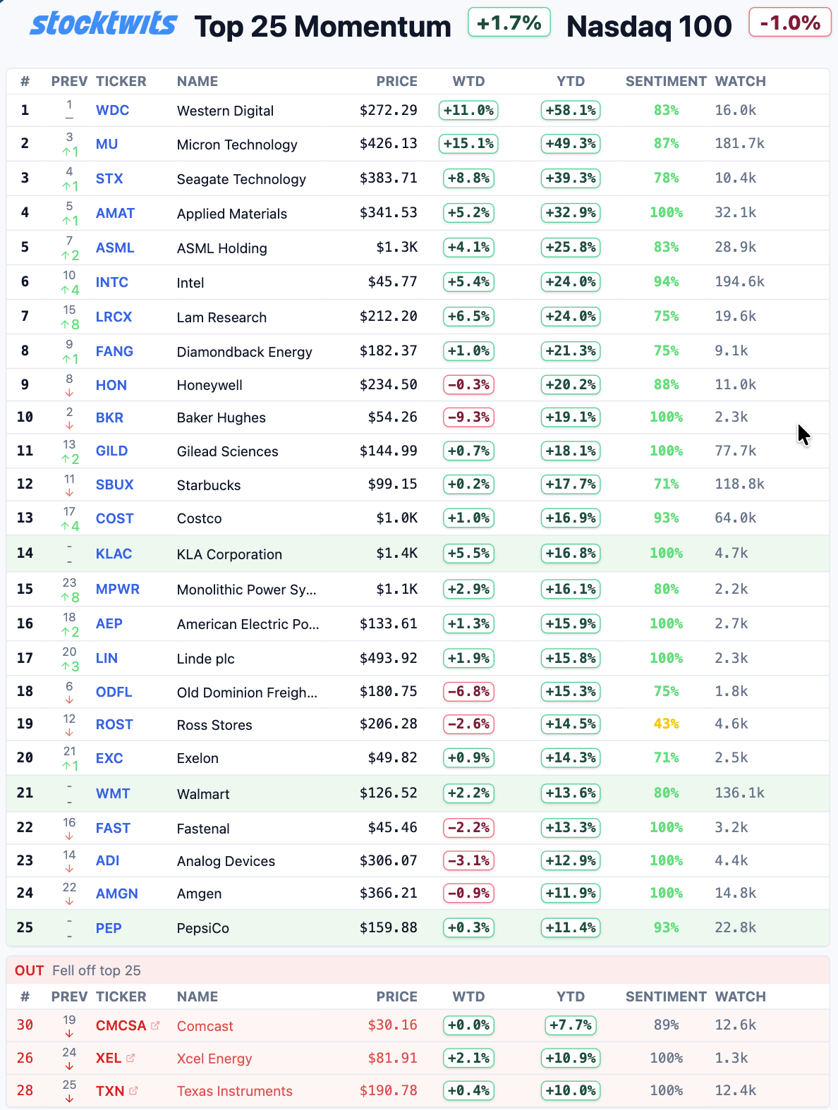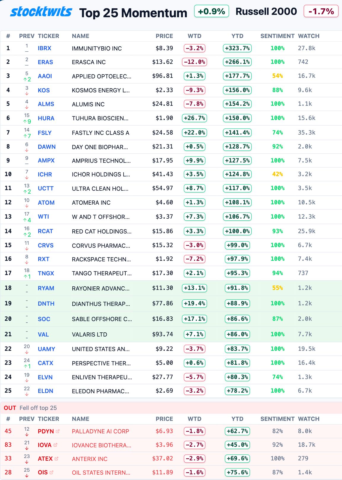 The Stocktwits Top 25 reports the 25 best-performing stocks in the S&P 500, Nasdaq 100, and Russell 2000 year to date and tracks their performances over time. To help you understand this data further, check out our FAQ page, and feel free to reach out if you have questions!
