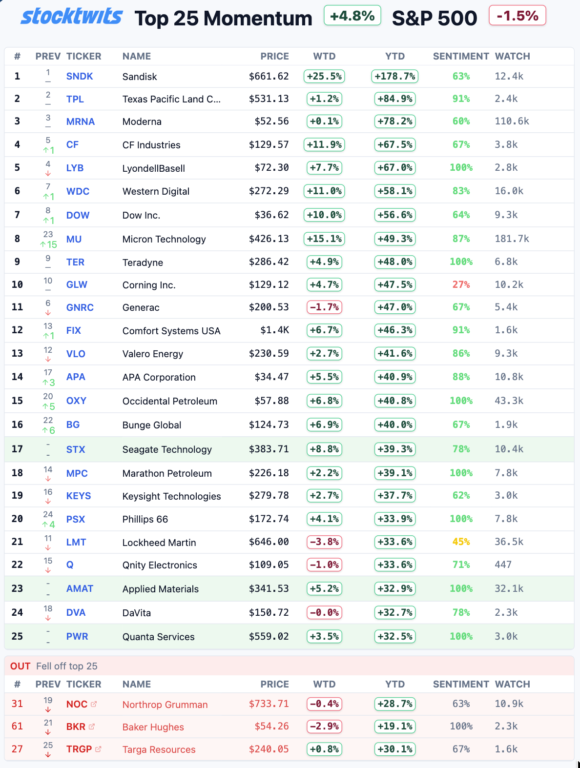 Sandisk's NAND Supercycle Keeps Running: The S&P 500's top momentum stock this week, $SNDK ( ▲ 6.92% ) surged roughly +25% in the past five sessions and has now climbed more than +1,000% since spinning out of Western Digital in early 2025, riding a NAND flash pricing upcycle that Wall Street is still scrambling to price in.