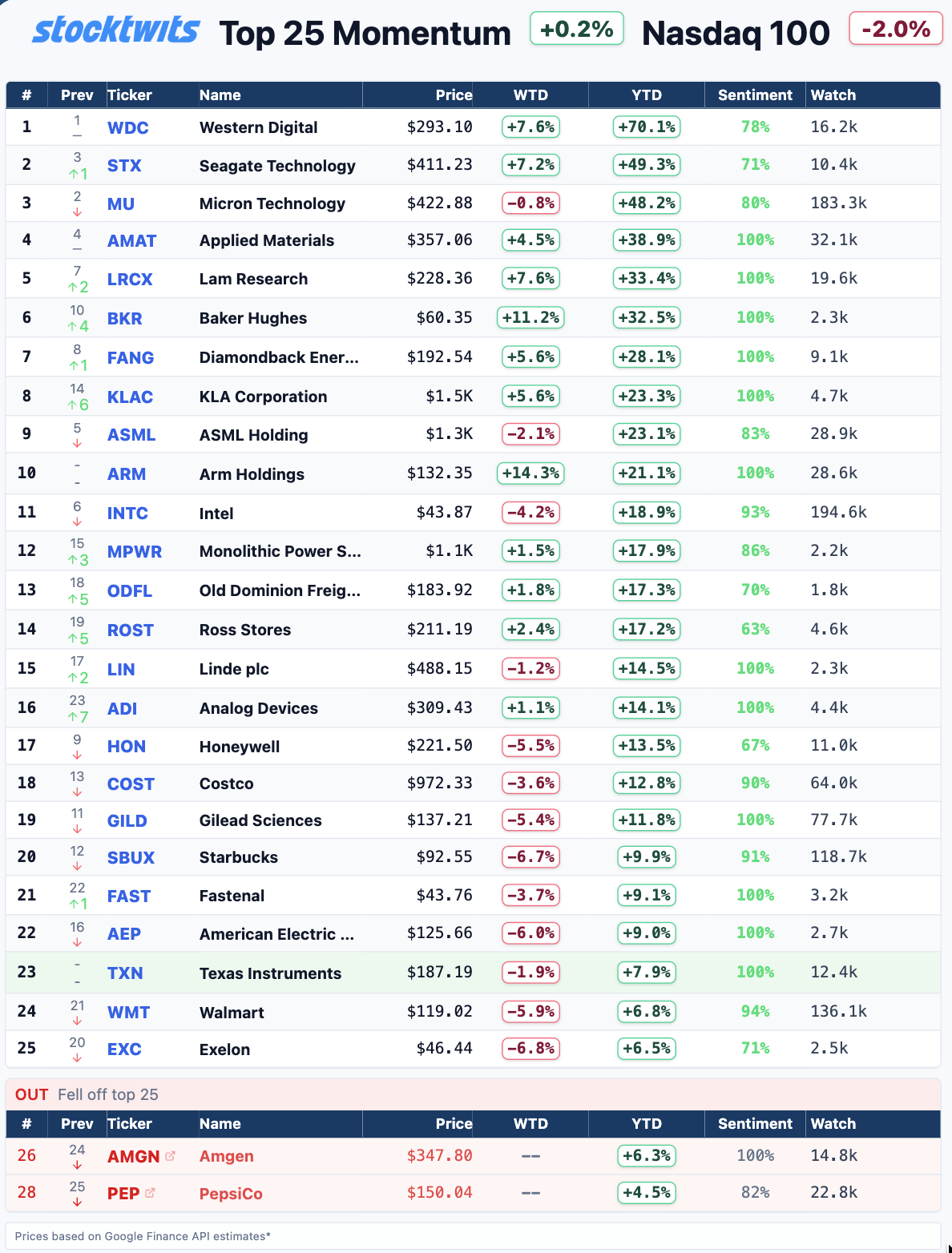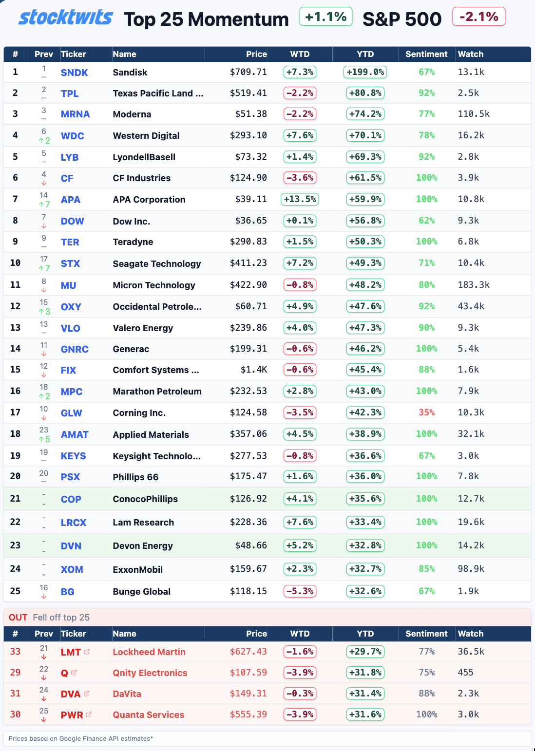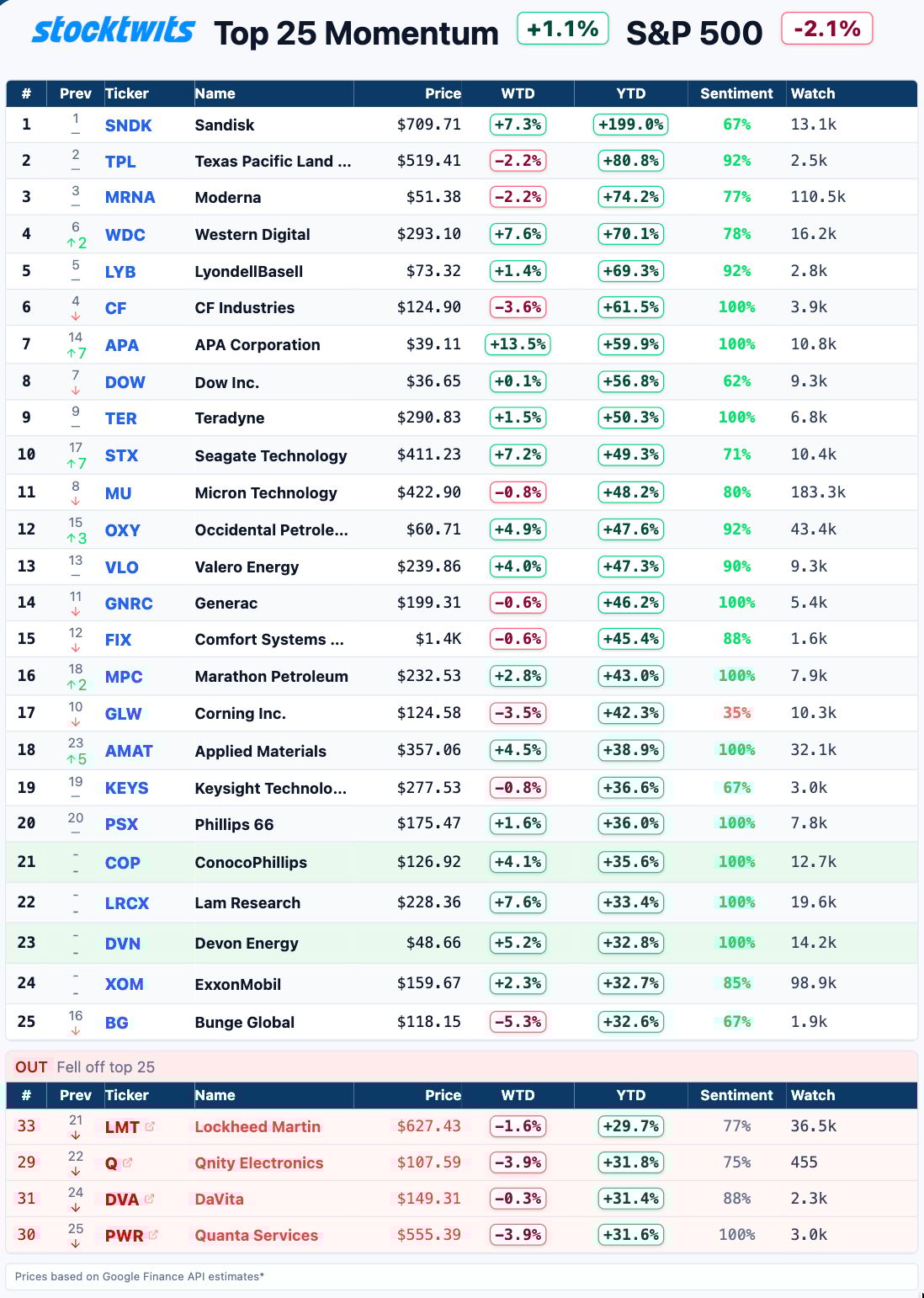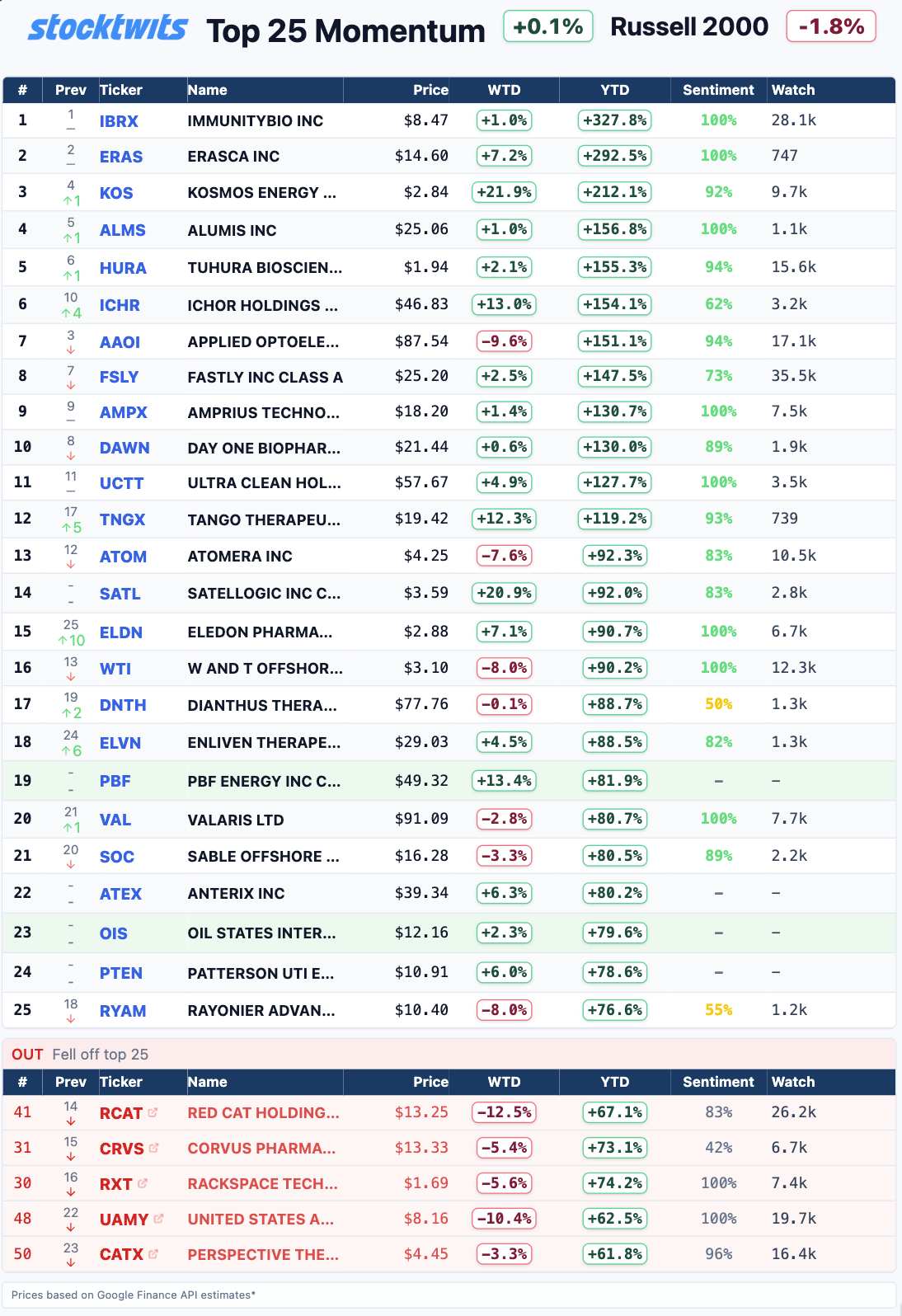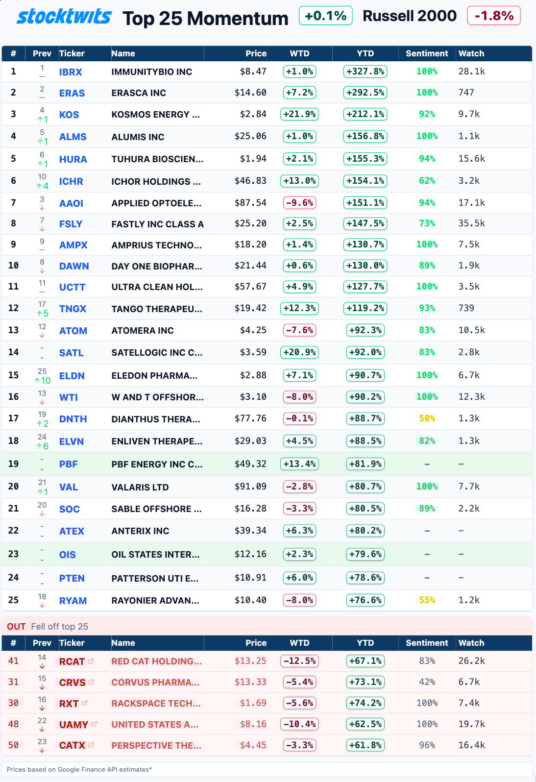 The Stocktwits Top 25 reports the 25 best-performing stocks in the S&P 500, Nasdaq 100, and Russell 2000 year to date and tracks their performances over time. To help you understand this data further, check out our FAQ page, and feel free to reach out if you have questions!