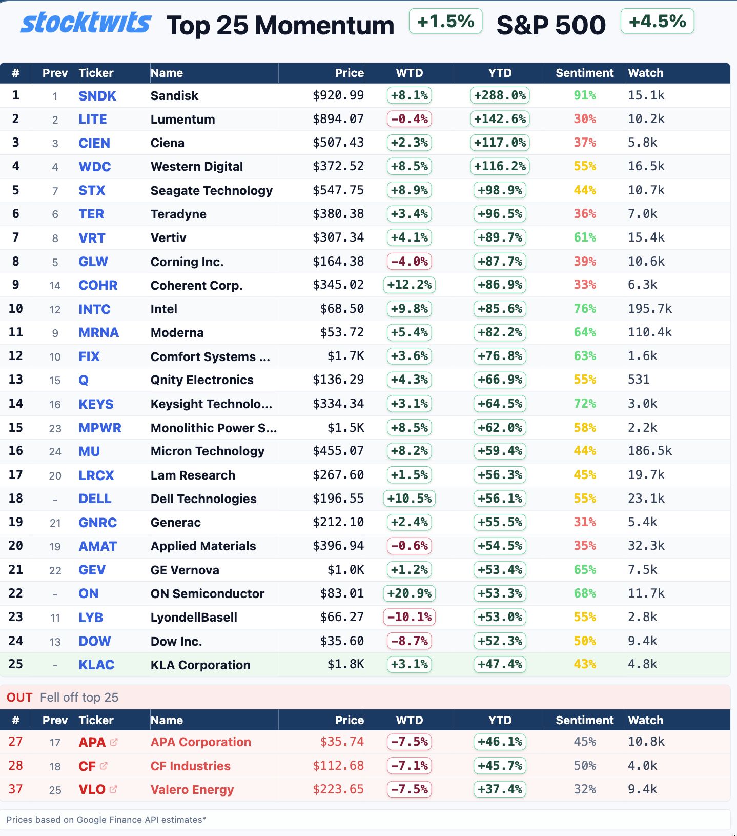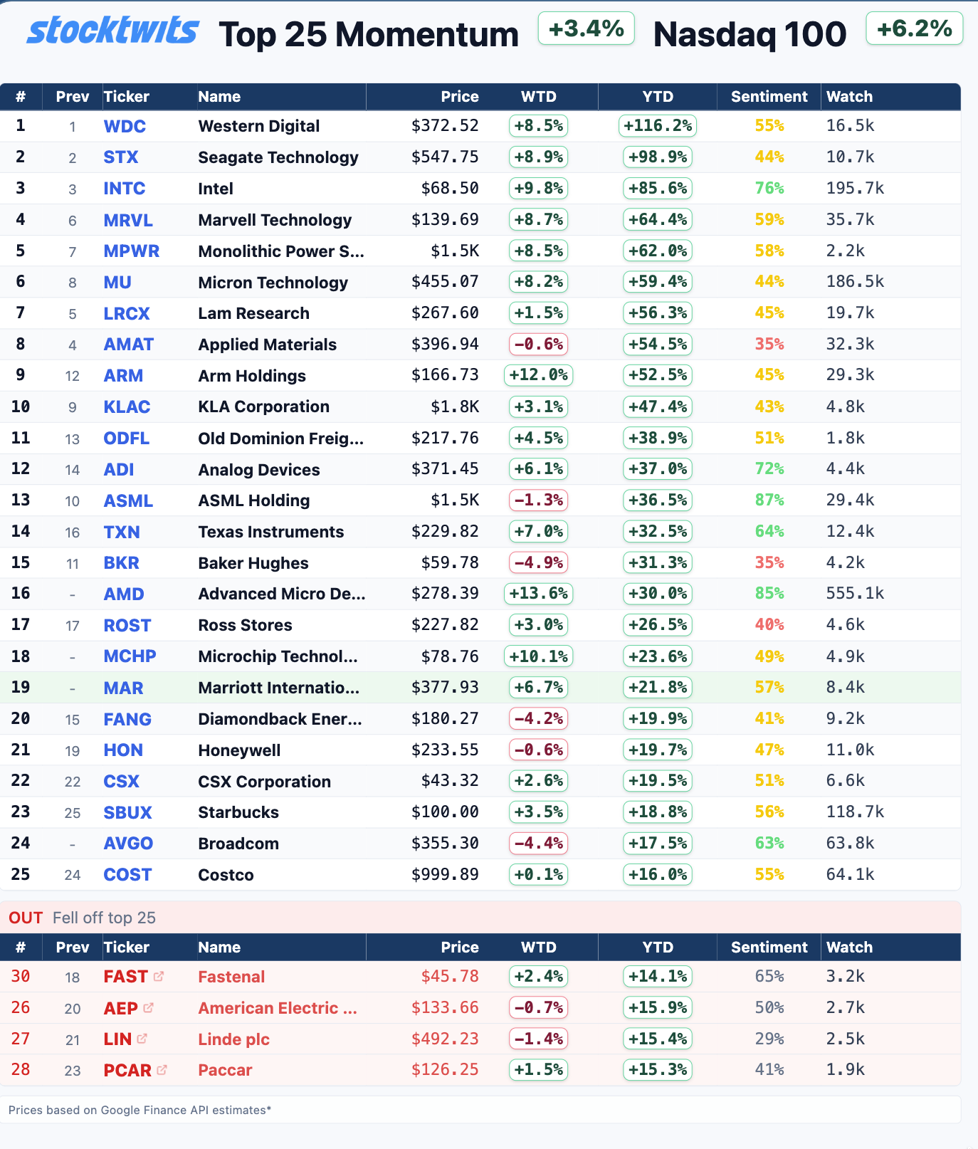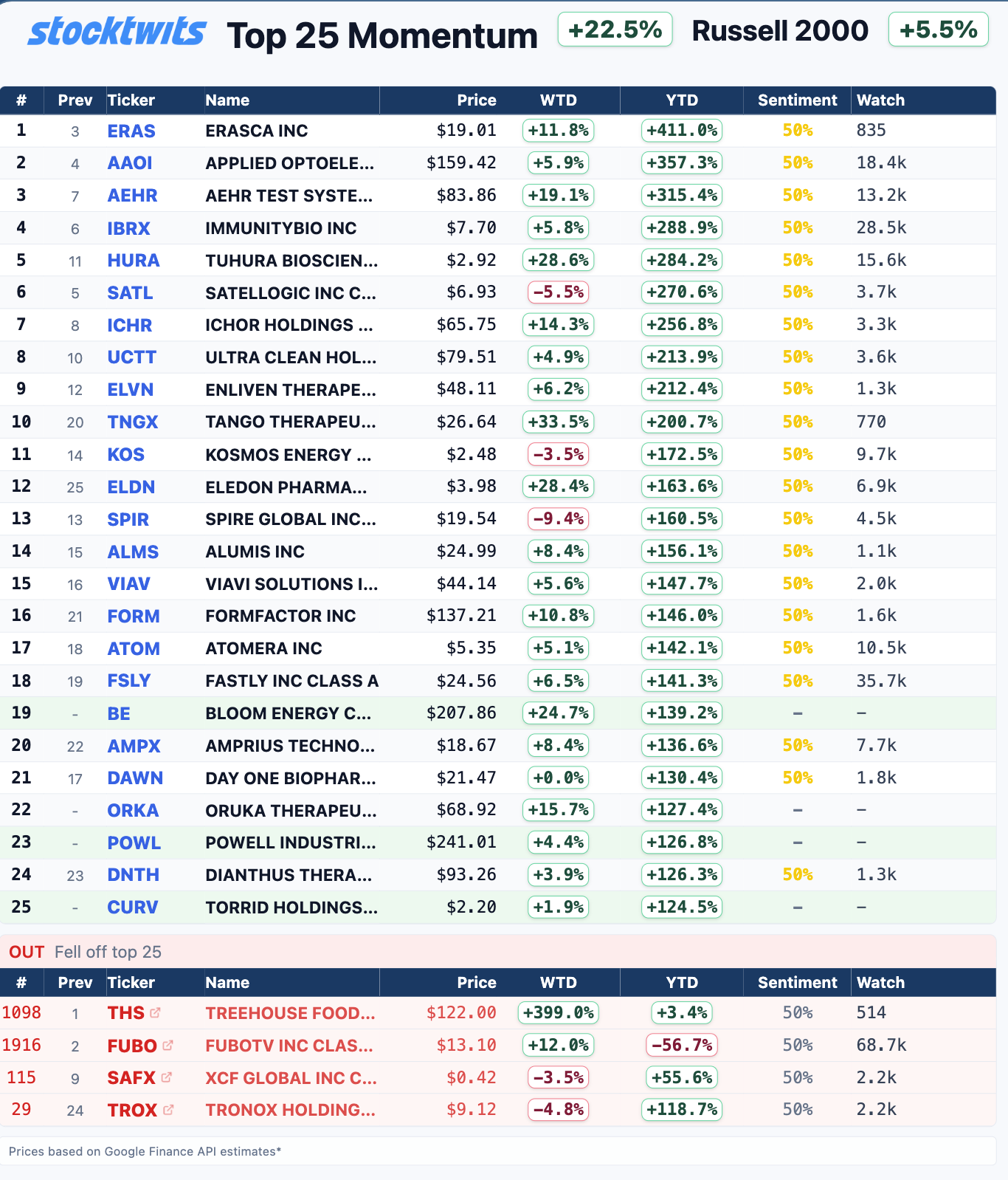 The Stocktwits Top 25 reports the 25 best-performing stocks in the S&P 500, Nasdaq 100, and Russell 2000 year to date and tracks their performances over time. To help you understand this data further, check out our FAQ page, and feel free to reach out if you have questions!