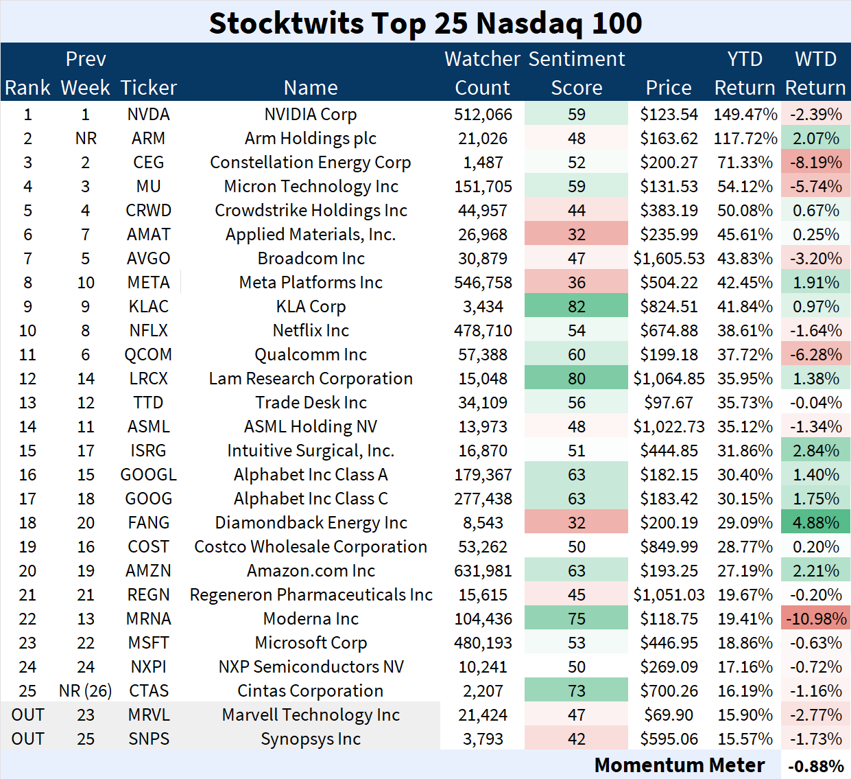 The Nasdaq 100 Top 25 list (-0.88%) underperformed the Nasdaq 100 index (-0.09%).