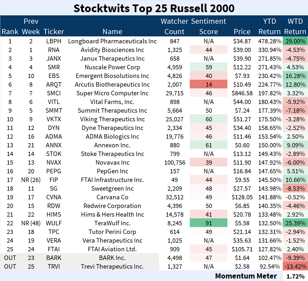 The Top 25 lists' Top Dawg was Longboard Pharmaceuticals for the second week in a row, after rallying 29.00%. 📈