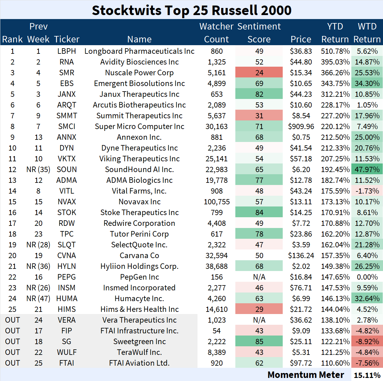 The Stocktwits Top 25 reports the 25 best-performing stocks in the S&P 500, Nasdaq 100, and Russell 2000 year to date (YTD) and tracks their performances over time.