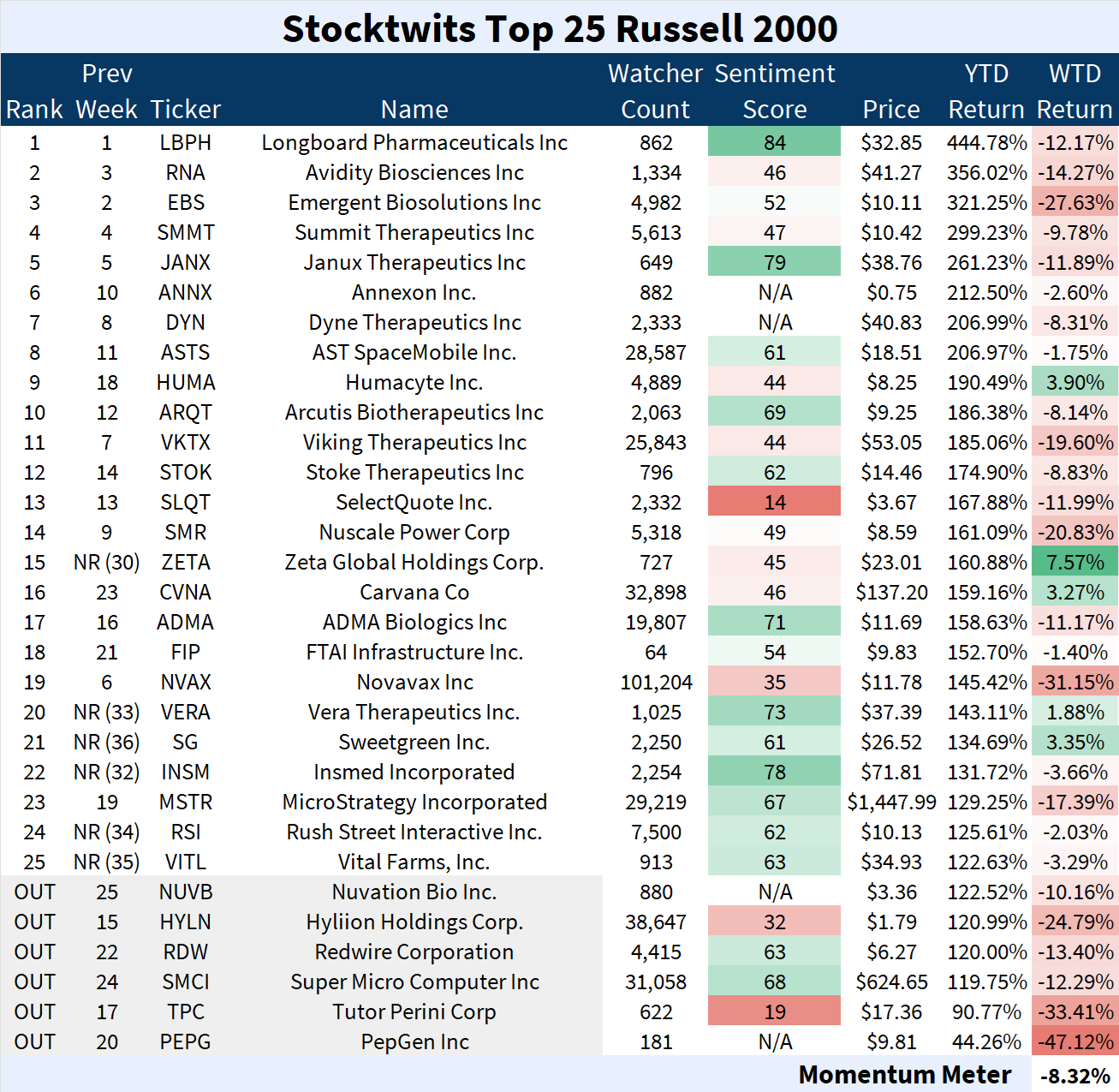 The Stocktwits Top 25 reports the 25 best-performing stocks in the S&P 500, Nasdaq 100, and Russell 2000 year to date (YTD) and tracks their performances over time.