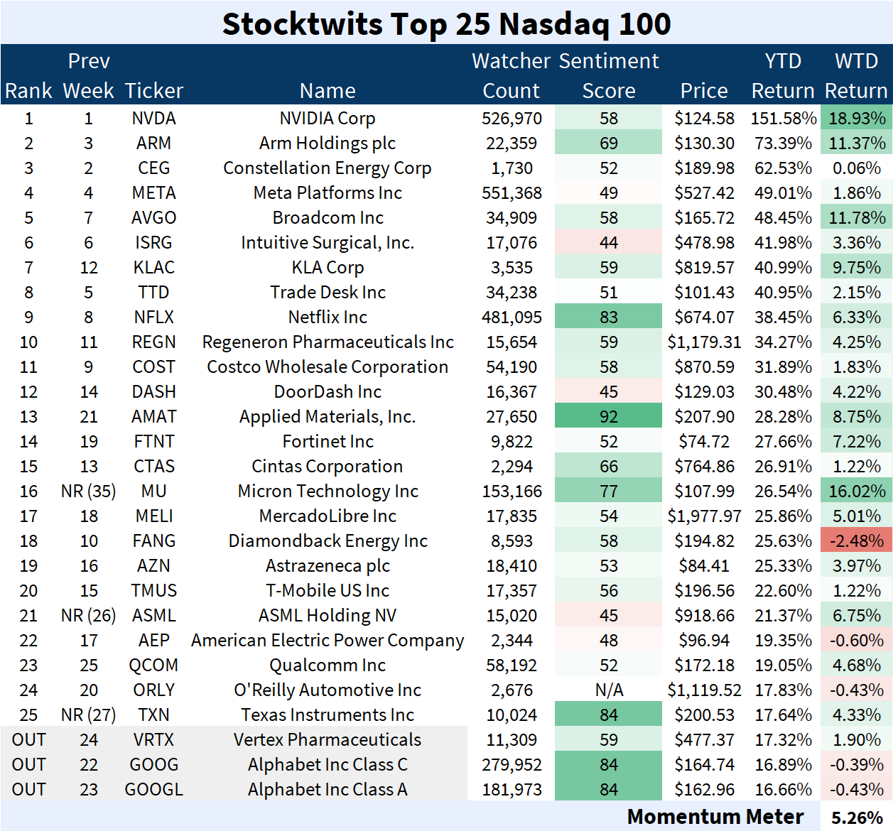 The Nasdaq 100 Top 25 list (+5.26%) underperformed the Nasdaq 100 index (+5.38%).