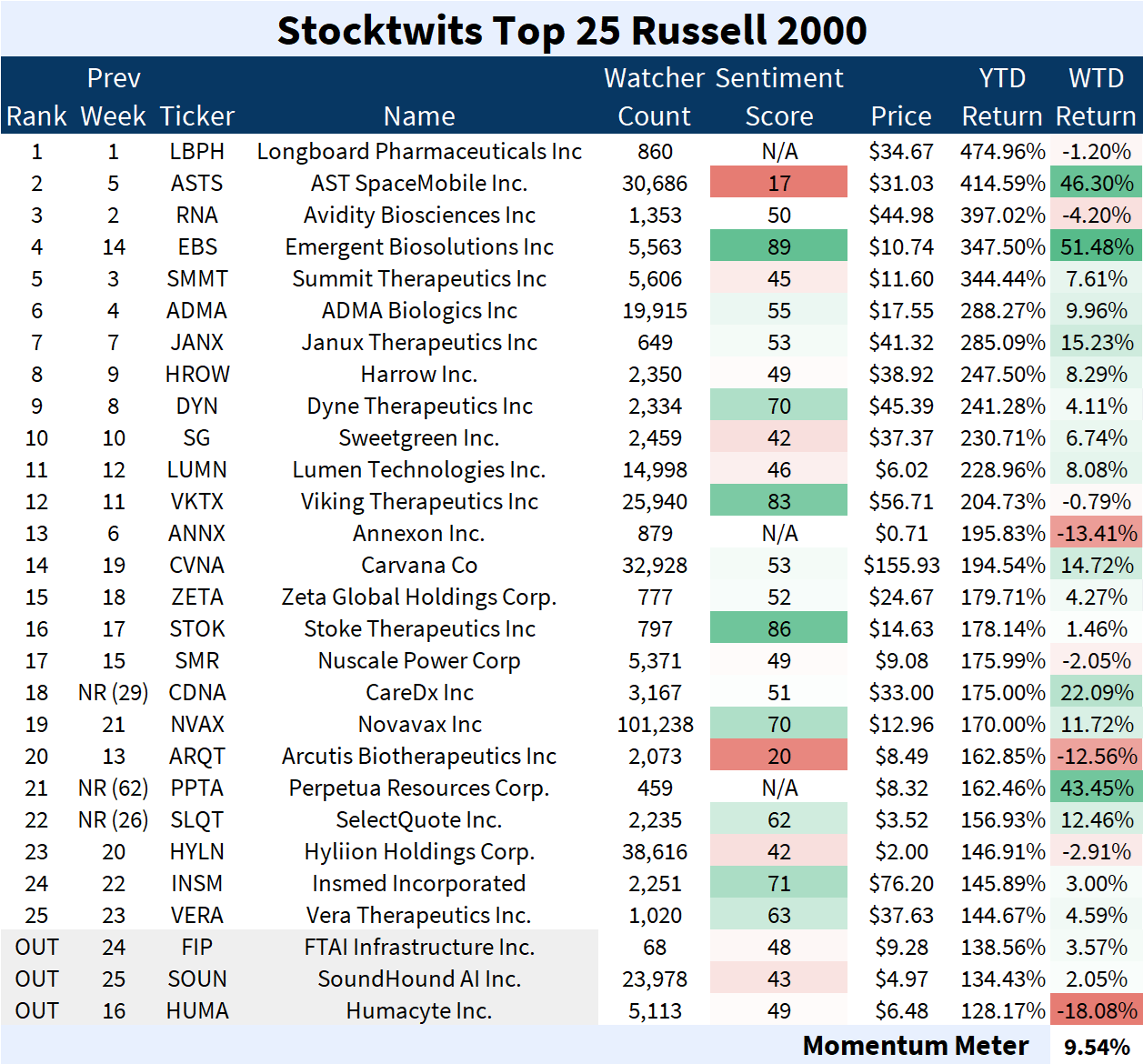 The Stocktwits Top 25 reports the 25 best-performing stocks in the S&P 500, Nasdaq 100, and Russell 2000 year to date (YTD) and tracks their performances over time.