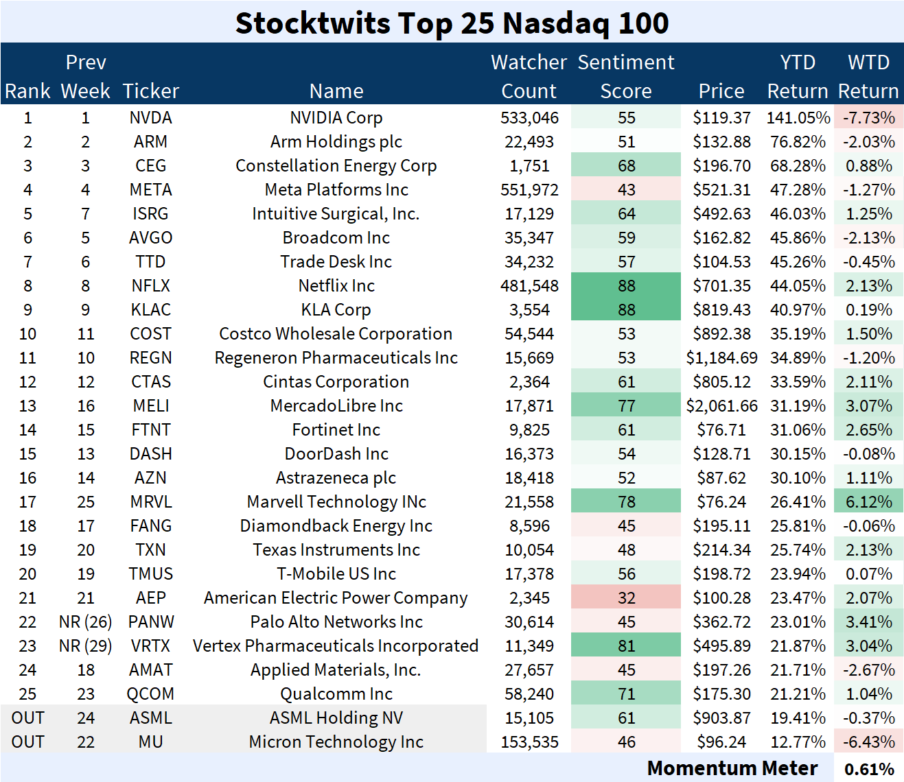 The Nasdaq 100 Top 25 list (+0.61%) outperformed the Nasdaq 100 index (-0.74%).