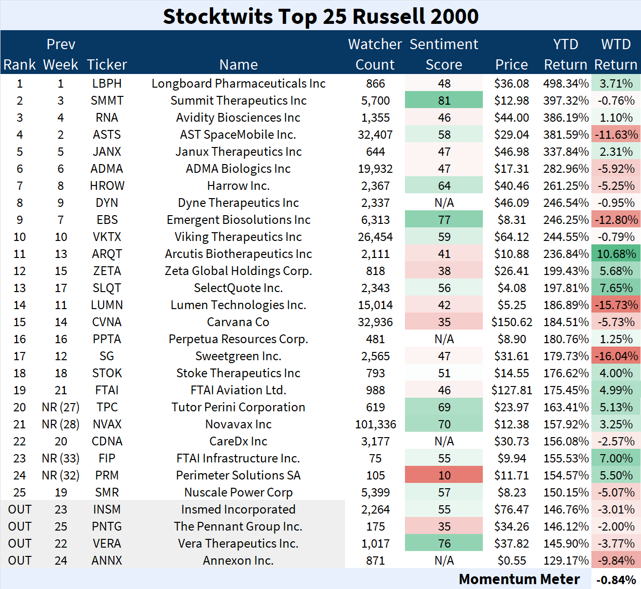 The Stocktwits Top 25 reports the 25 best-performing stocks in the S&P 500, Nasdaq 100, and Russell 2000 year to date (YTD) and tracks their performances over time.