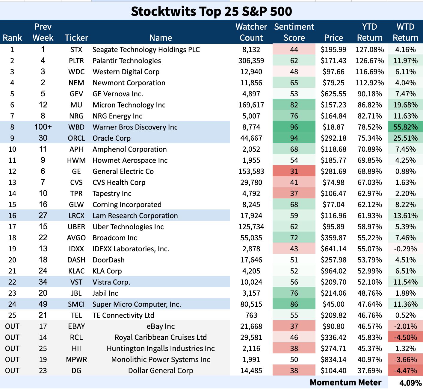 The Stocktwits Top 25 reports the 25 best-performing stocks in the S&P 500, Nasdaq 100, and Russell 2000 year to date (YTD) and tracks their performances over time. To help you understand this data further, check out our FAQ page, and feel free to reach out if you have questions!