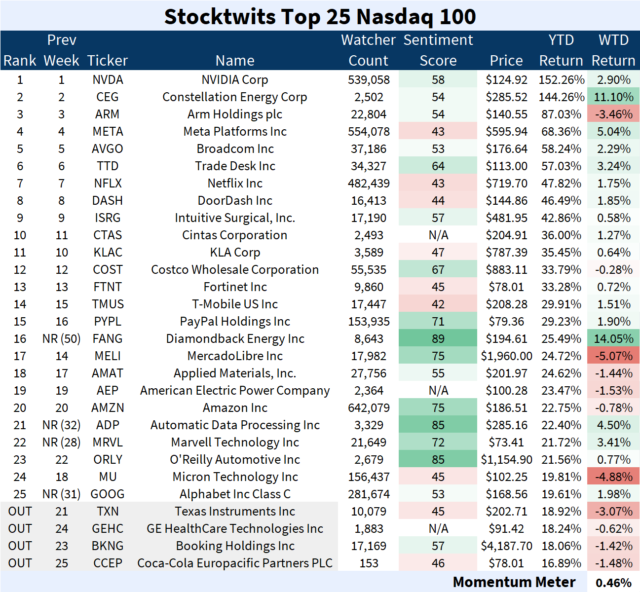 The Nasdaq 100 Top 25 list (+0.46%) outperformed the Nasdaq 100 index (+0.13%).