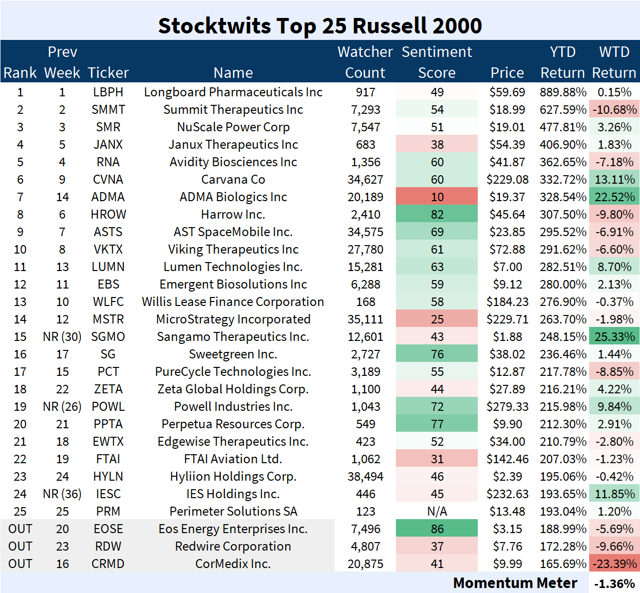 The Stocktwits Top 25 reports the 25 best-performing stocks in the S&P 500, Nasdaq 100, and Russell 2000 year to date (YTD) and tracks their performances over time.