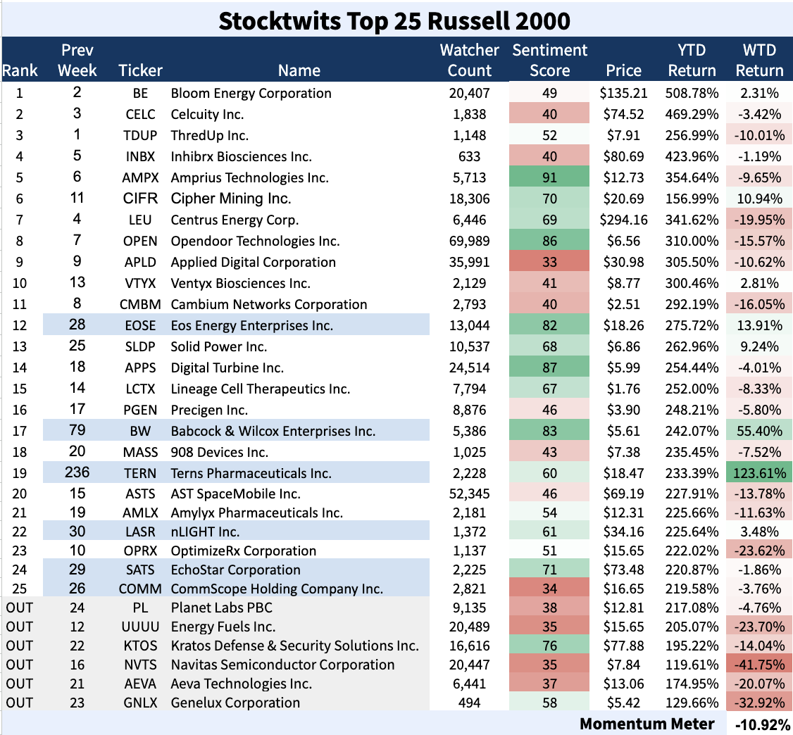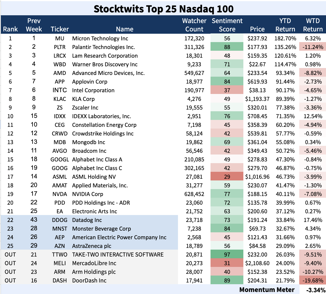 The Stocktwits Top 25 reports the 25 best-performing stocks in the S&P 500, Nasdaq 100, and Russell 2000 year to date (YTD) and tracks their performances over time. To help you understand this data further, check out our FAQ page, and feel free to reach out if you have questions!
