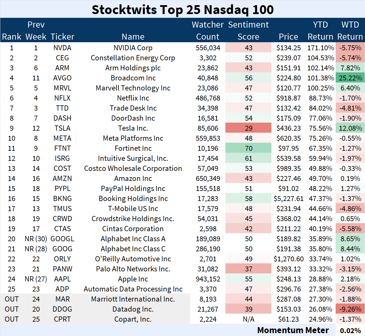 The Stocktwits Top 25 reports the 25 best-performing stocks in the S&P 500, Nasdaq 100, and Russell 2000 year to date (YTD) and tracks their performances over time.