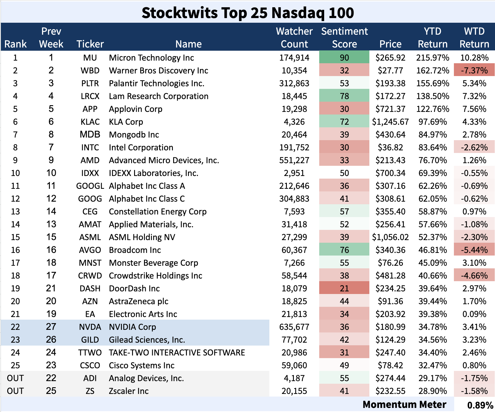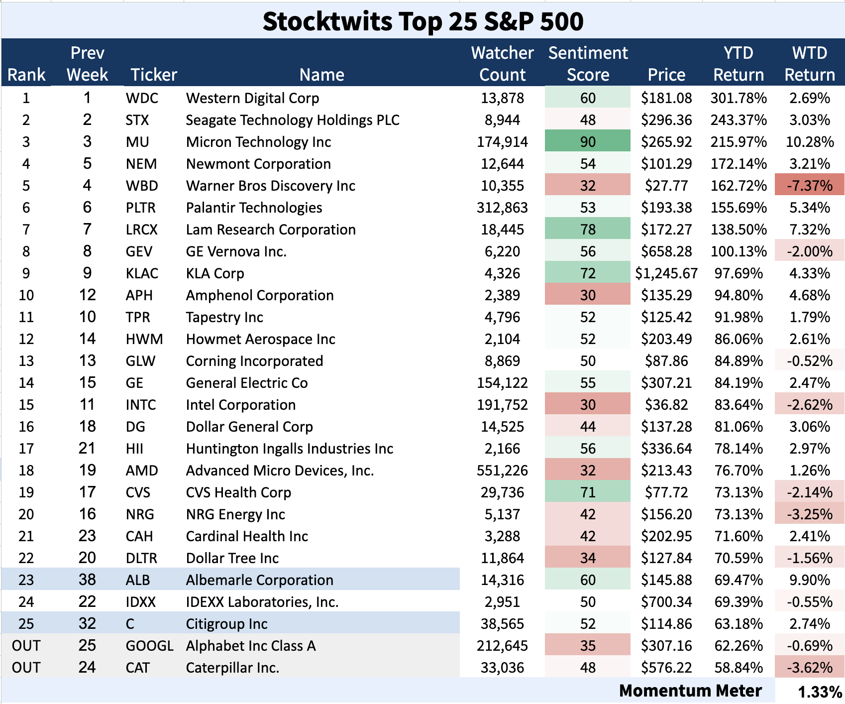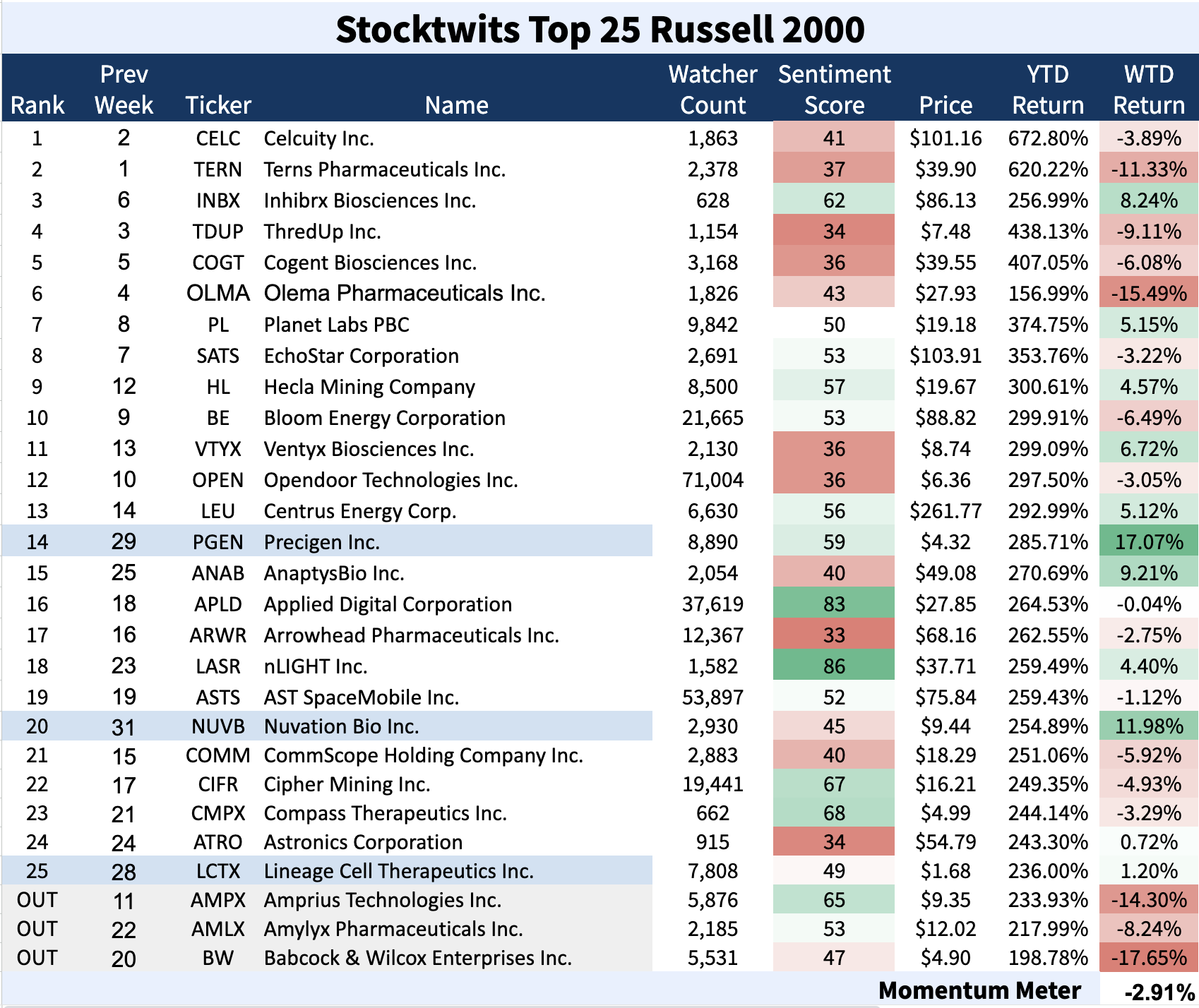 The Stocktwits Top 25 reports the 25 best-performing stocks in the S&P 500, Nasdaq 100, and Russell 2000 year to date and tracks their performances over time. To help you understand this data further, check out our FAQ page, and feel free to reach out if you have questions!