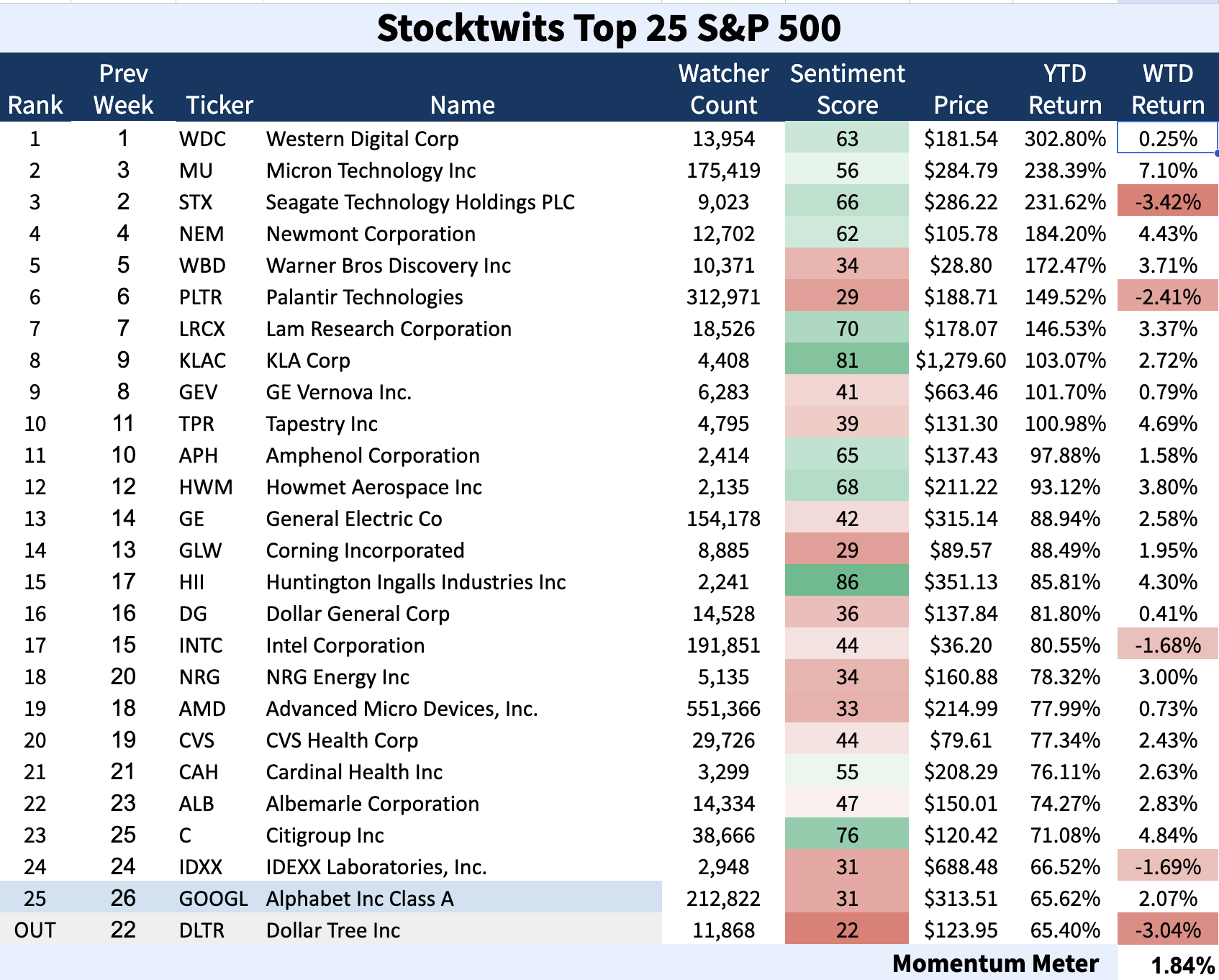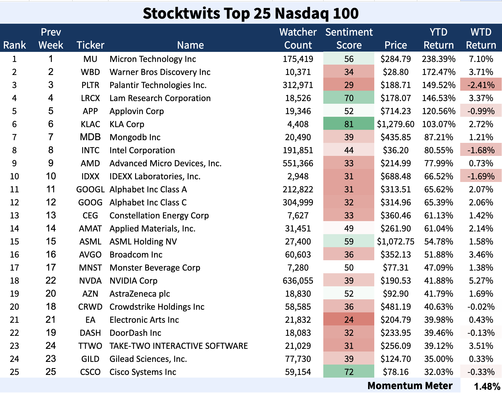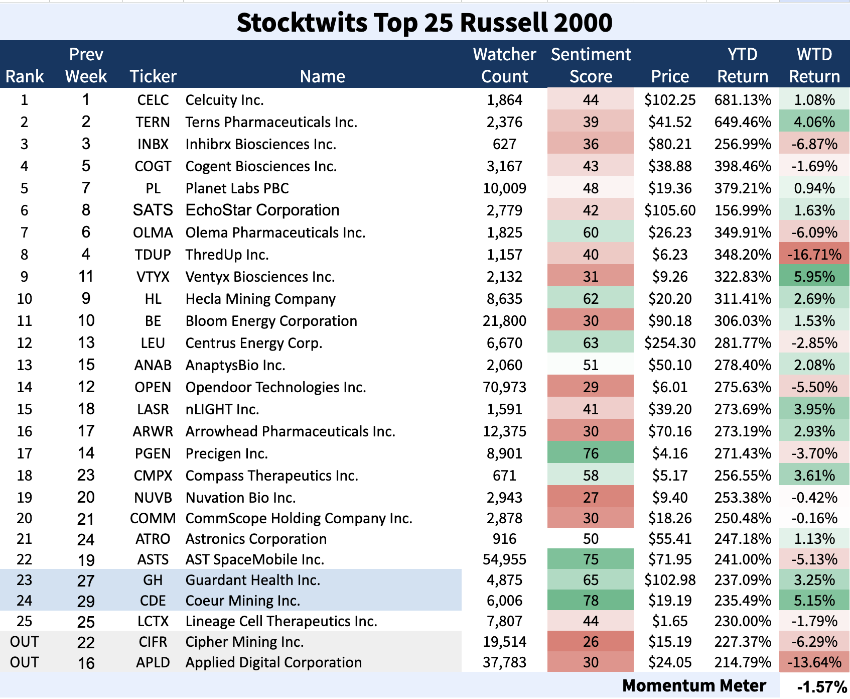 The Stocktwits Top 25 reports the 25 best-performing stocks in the S&P 500, Nasdaq 100, and Russell 2000 year to date and tracks their performances over time. To help you understand this data further, check out our FAQ page, and feel free to reach out if you have questions!