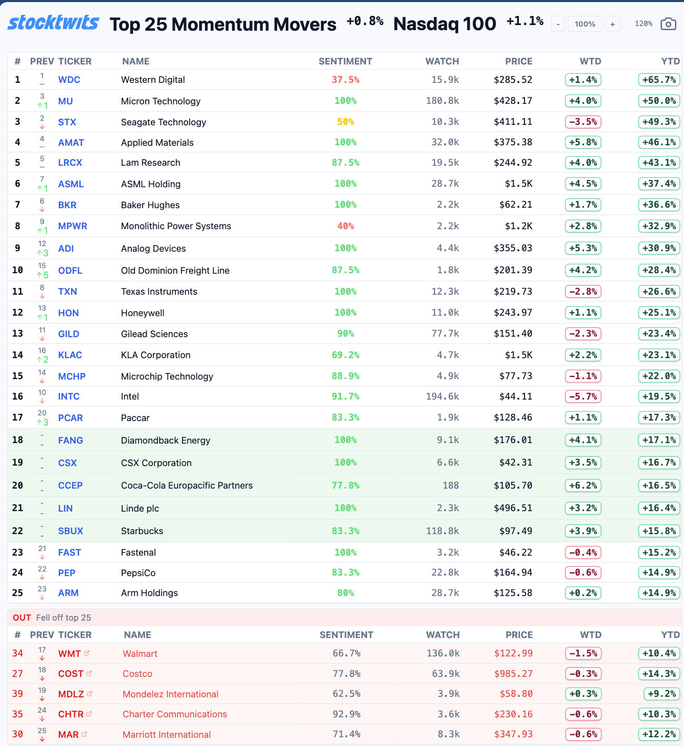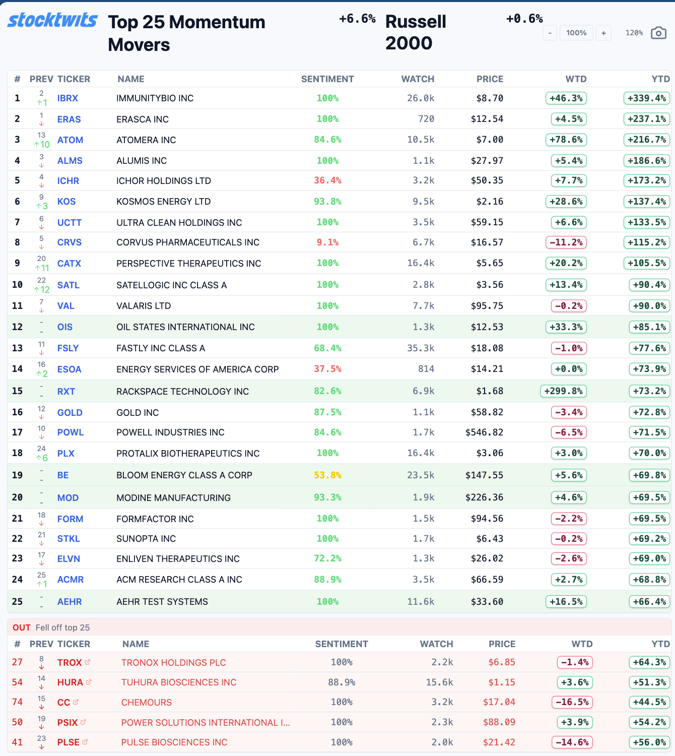 The Stocktwits Top 25 reports the 25 best-performing stocks in the S&P 500, Nasdaq 100, and Russell 2000 year to date and tracks their performances over time. To help you understand this data further, check out our FAQ page, and feel free to reach out if you have questions!
