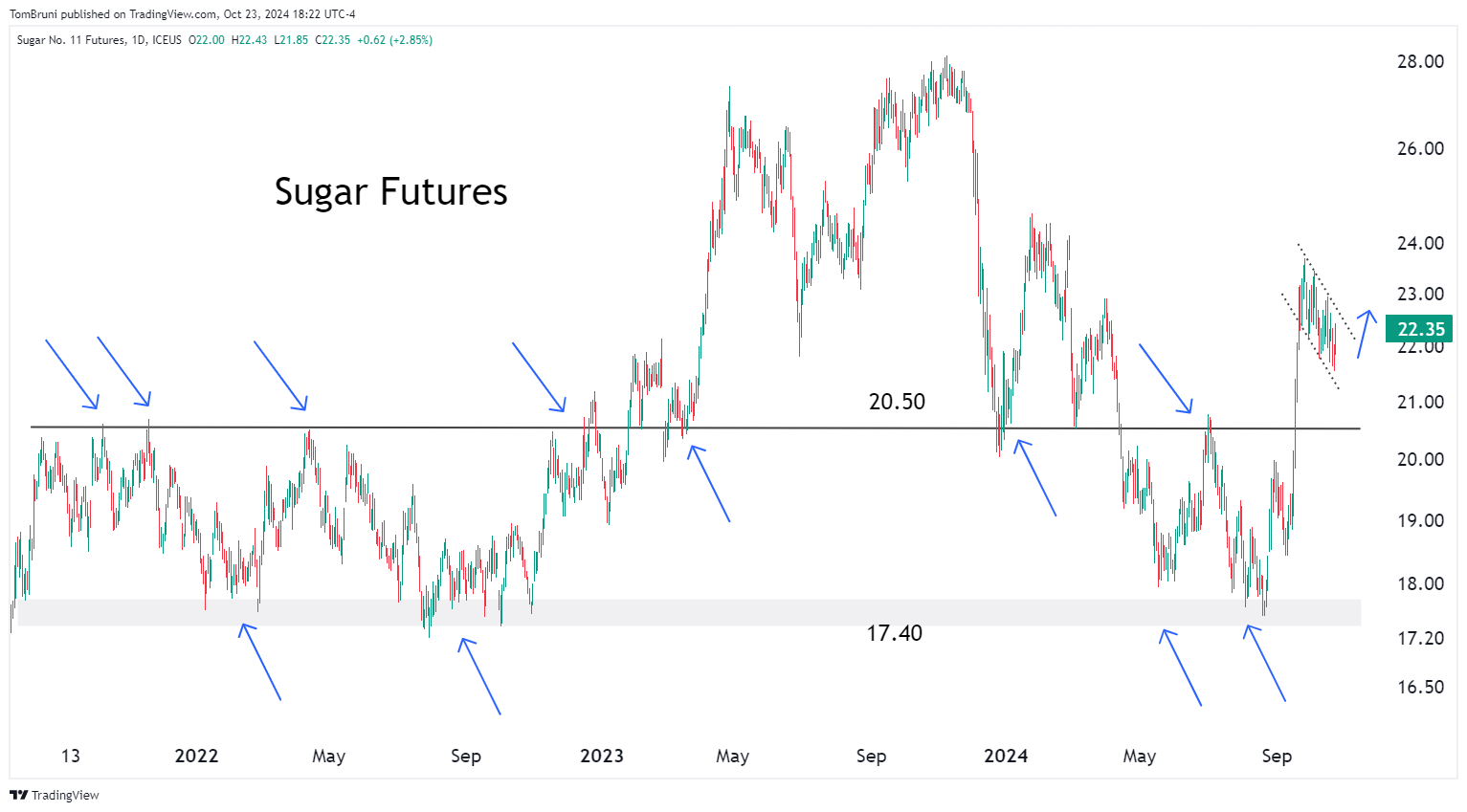 Technical analysts say the recent consolidation is a classic “bull flag” pattern, allowing prices to reset after a strong run and set up for their next leg higher. A move out of this pattern would target the 2023 highs between 26 and 28 through year-end. 😋